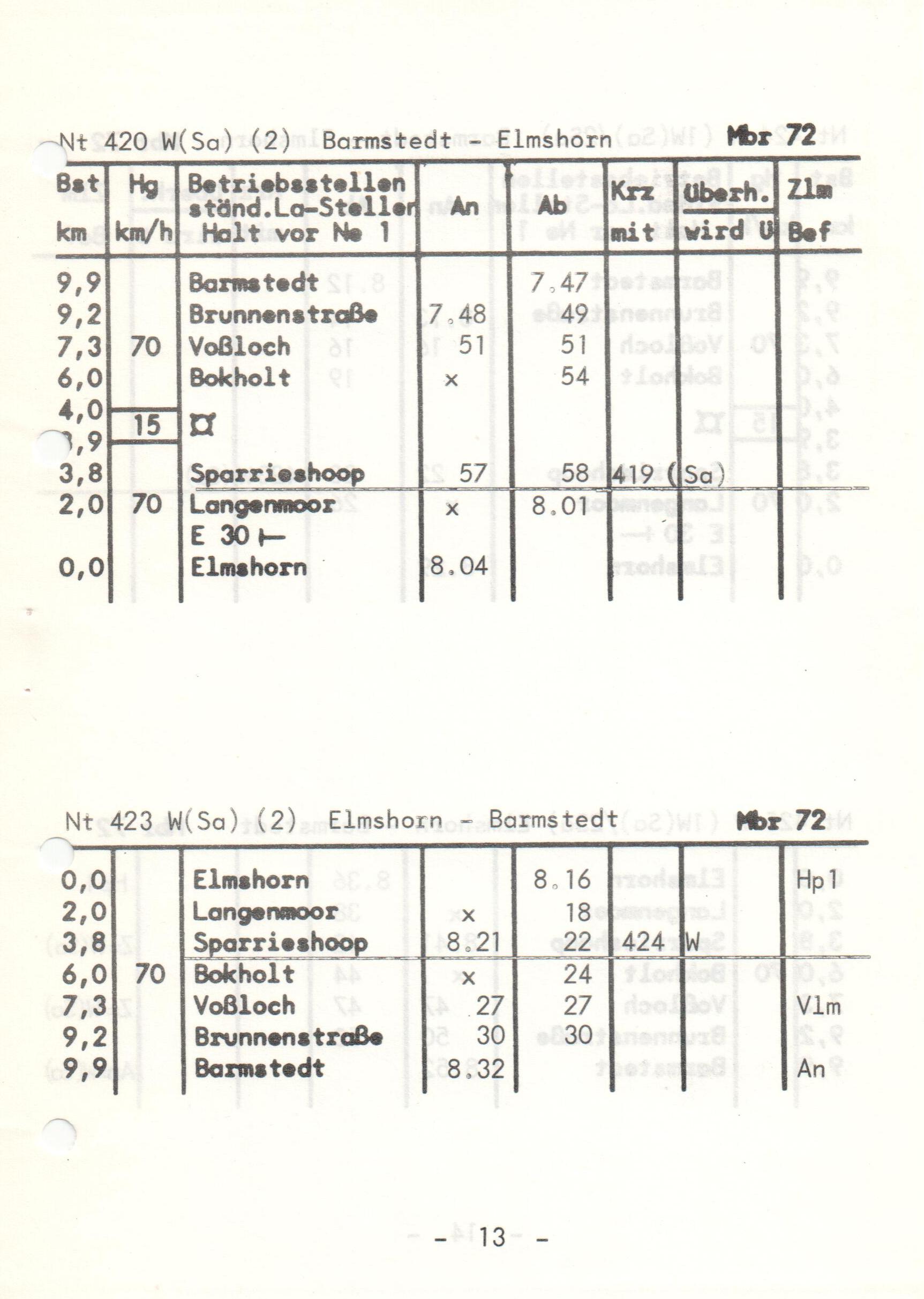 Eine Seite des Buchfahrplans der EBO gültig vom 22. Mai 1977. Der Buchfahrplan im DIN A5 Format enthält die Abfahrtszeiten aller Personenzüge sowie der regelmäßigen Güterzüge an Samstagen.