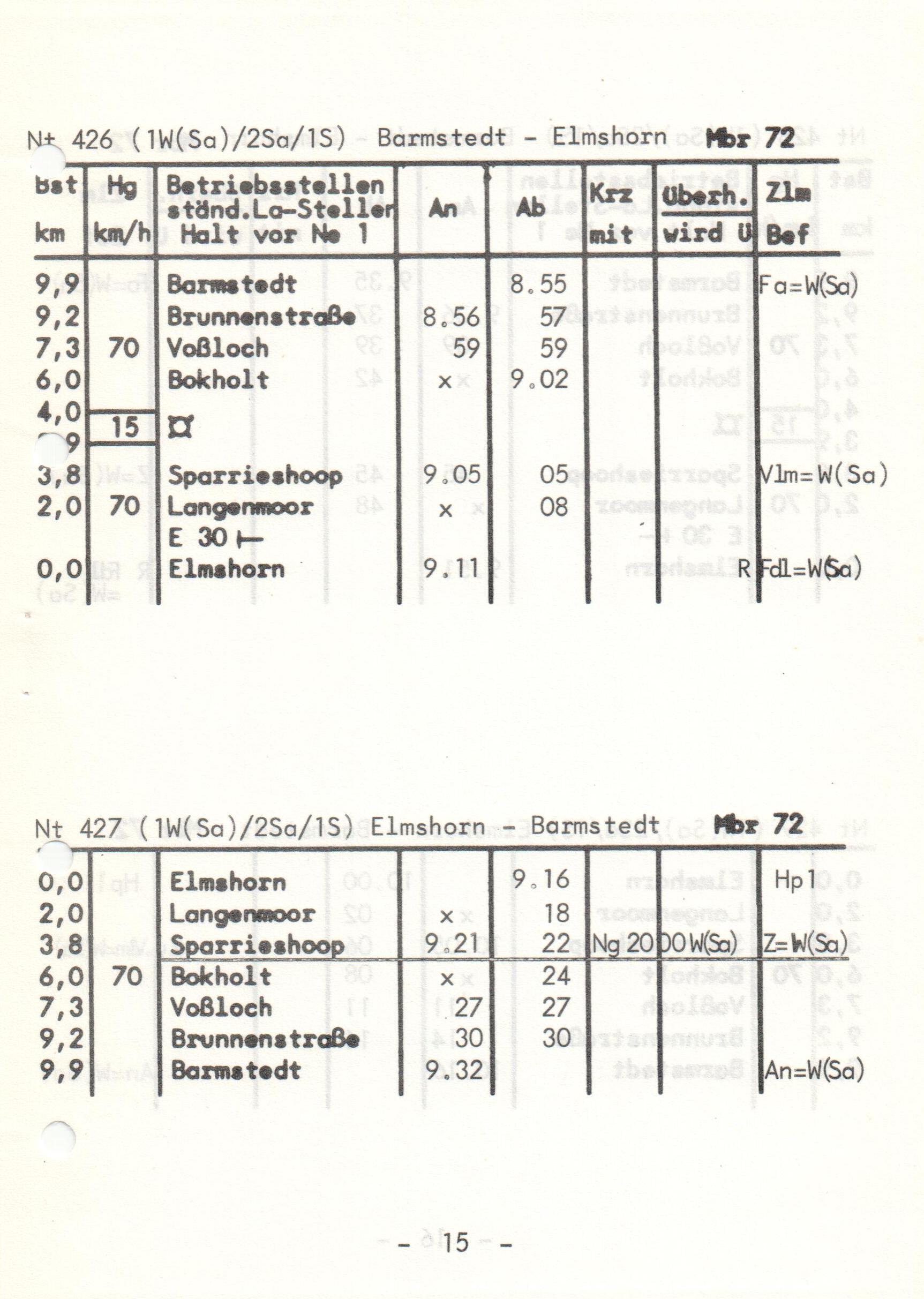 Eine Seite des Buchfahrplans der EBO gültig vom 22. Mai 1977. Der Buchfahrplan im DIN A5 Format enthält die Abfahrtszeiten aller Personenzüge sowie der regelmäßigen Güterzüge an Samstagen.