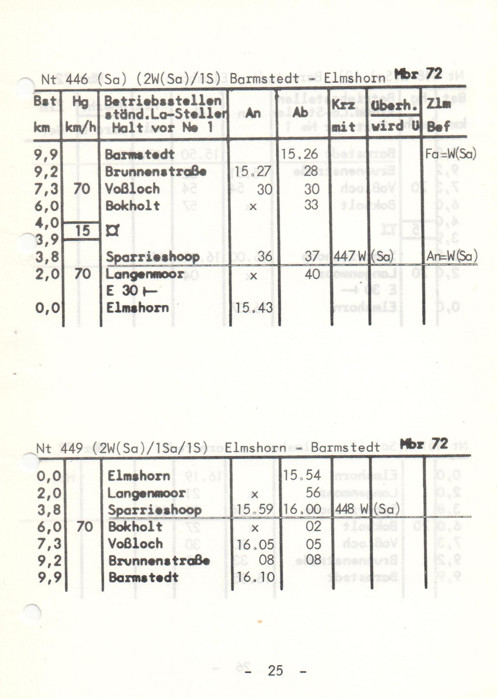 Eine Seite des Buchfahrplans der EBO gültig vom 22. Mai 1977. Der Buchfahrplan im DIN A5 Format enthält die Abfahrtszeiten aller Personenzüge sowie der regelmäßigen Güterzüge an Samstagen.