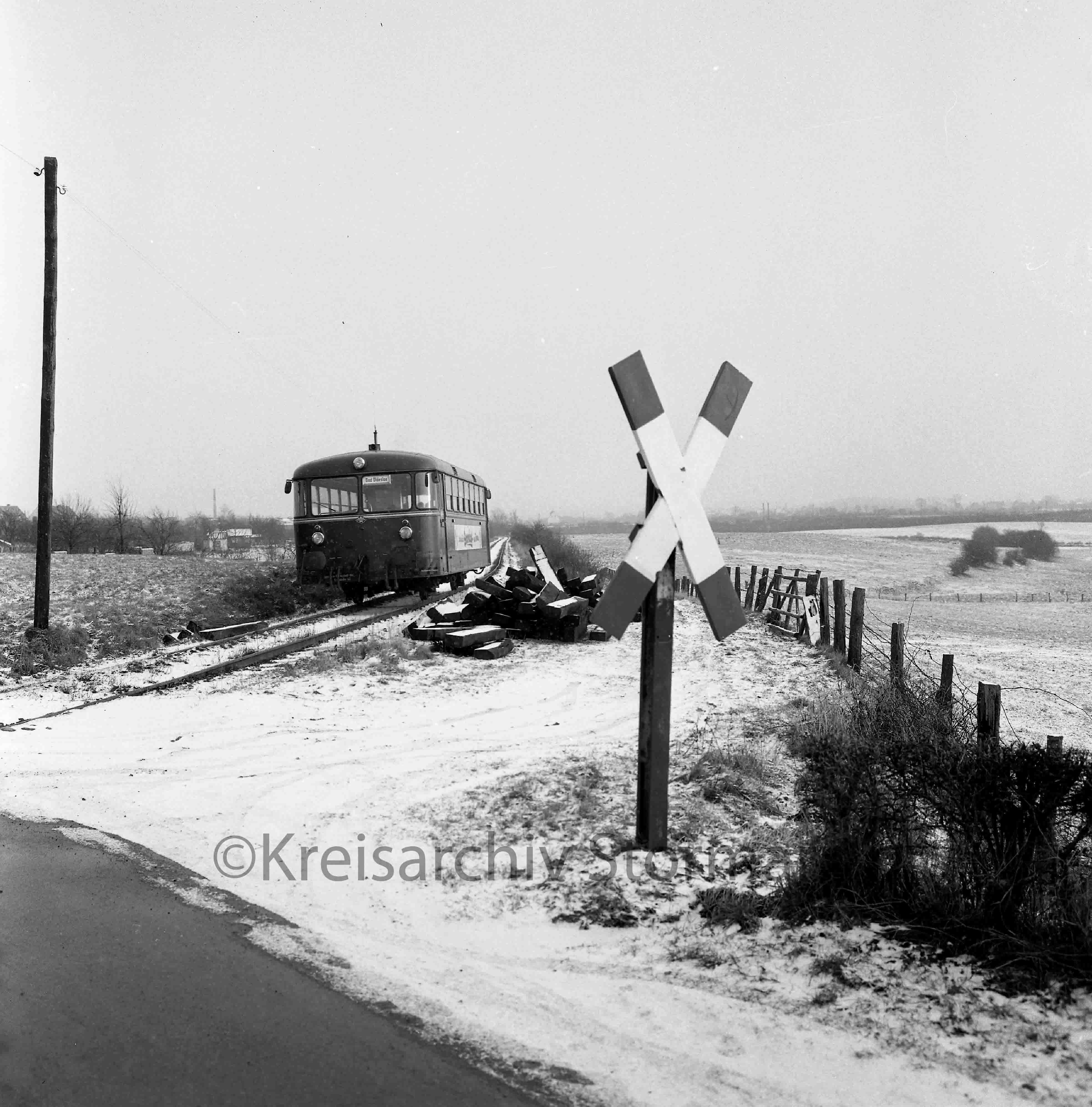 Ein Schienenbus der EBOE auf Höhe des Bü Rümpeler Weg auf der Fahrt nach Bad Oldesloe im Winter 1967. Bei diesem Fahrzeug kann es sich nur um VT 3.07 oder VT 3.08 handeln. Zum Zeitpunkt der Aufnahme waren VT 3.09 und VT 3.10 noch nicht vorhanden.