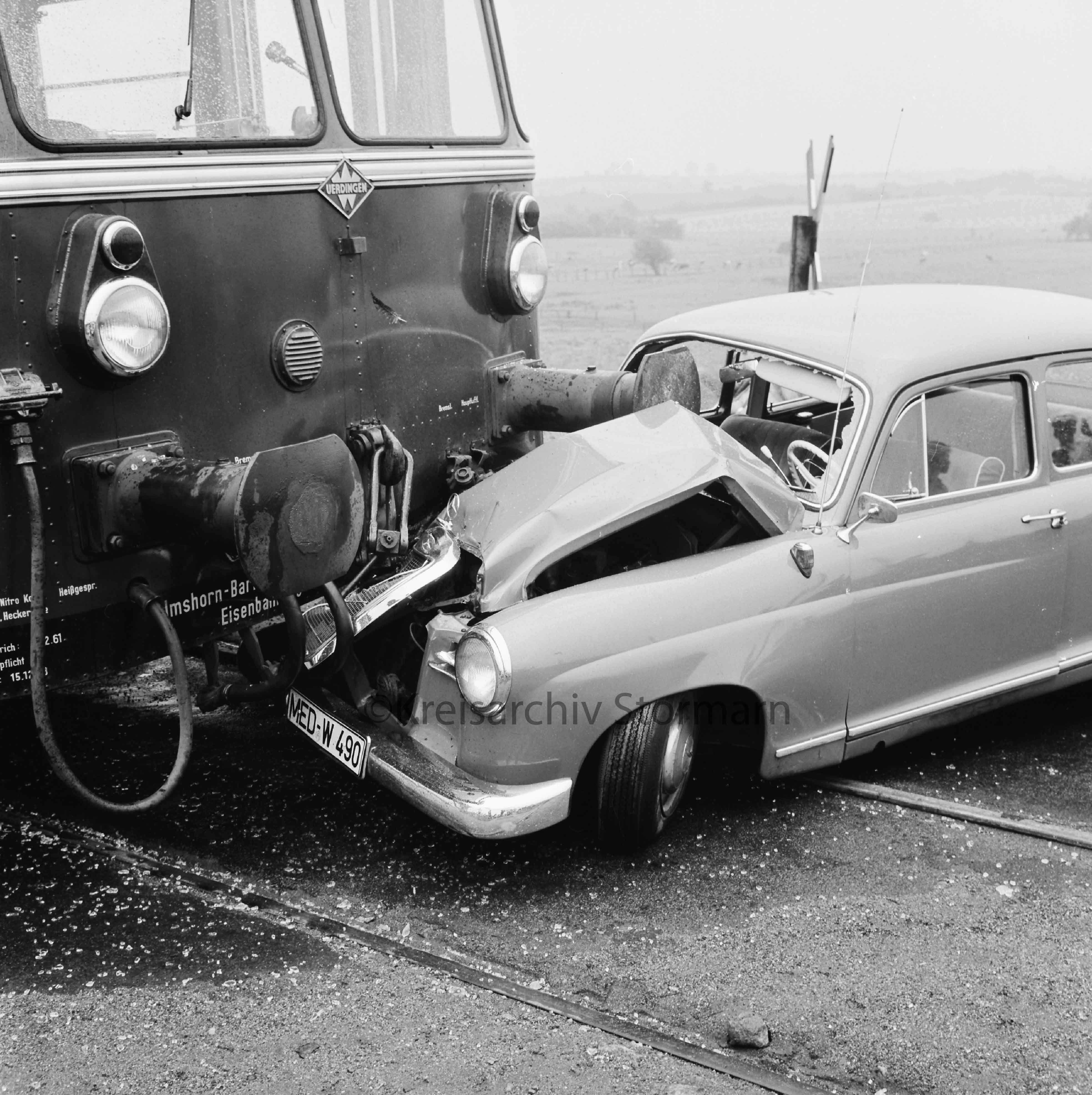 Dieses Bild zeigt einen Unfall am Bahnübergang Rümpeler Weg aus dem Jahre 1963. Beteiligt waren ein Uerdinger Schienenbus der EBOE und ein PKW der Marke Mercedes Benz. Der PKW hat nach dem Unfall nur noch Schrottwert während der Triebwagen nur wenig Schaden genommen hat.