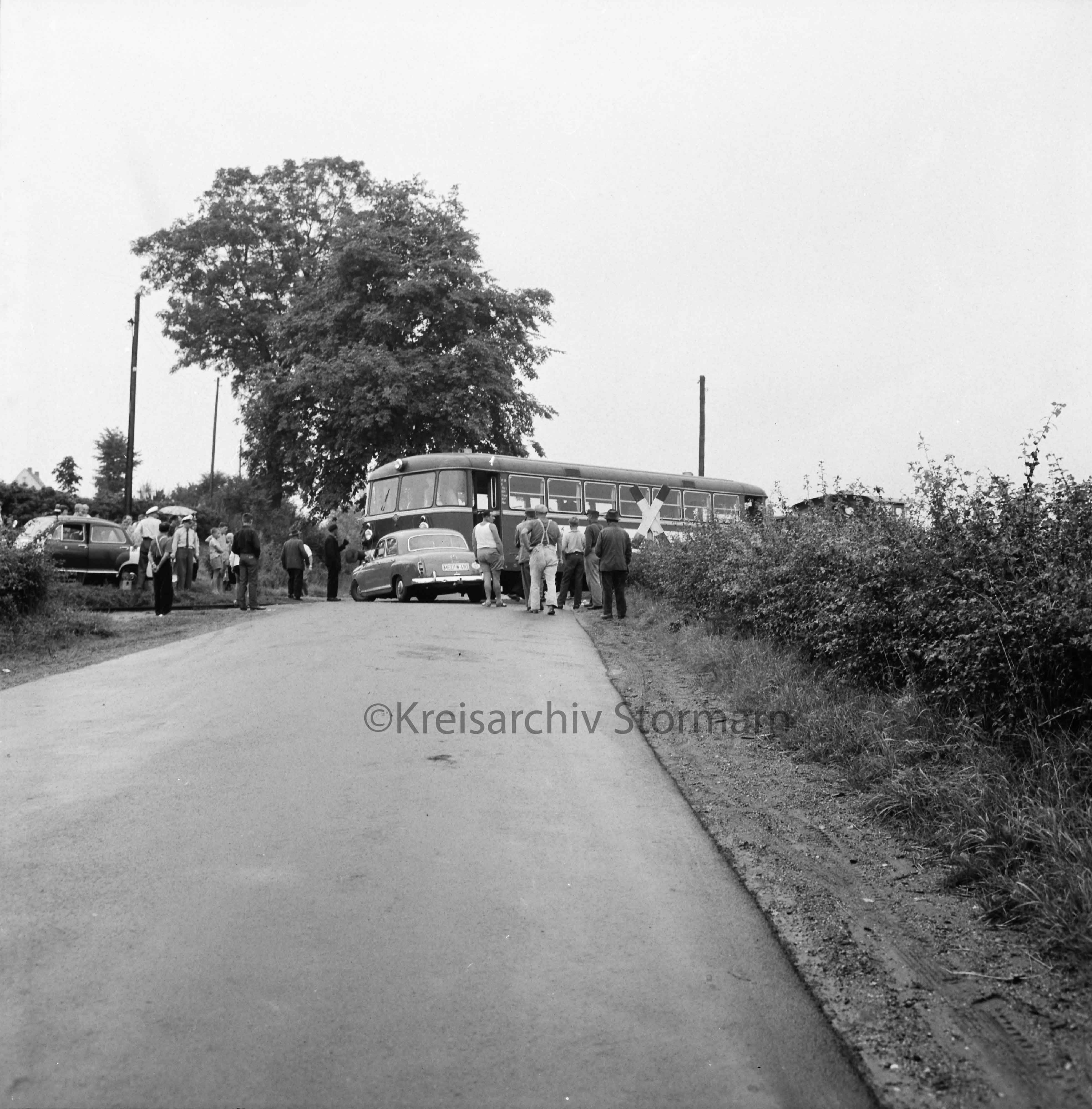 Dieses Bild zeigt einen Unfall am Bahnübergang Rümpeler Weg aus dem Jahre 1963. Beteiligt waren ein Uerdinger Schienenbus der EBOE und ein PKW der Marke Mercedes Benz. Der PKW hat nach dem Unfall nur noch Schrottwert während der Triebwagen nur wenig Schaden genommen hat.
