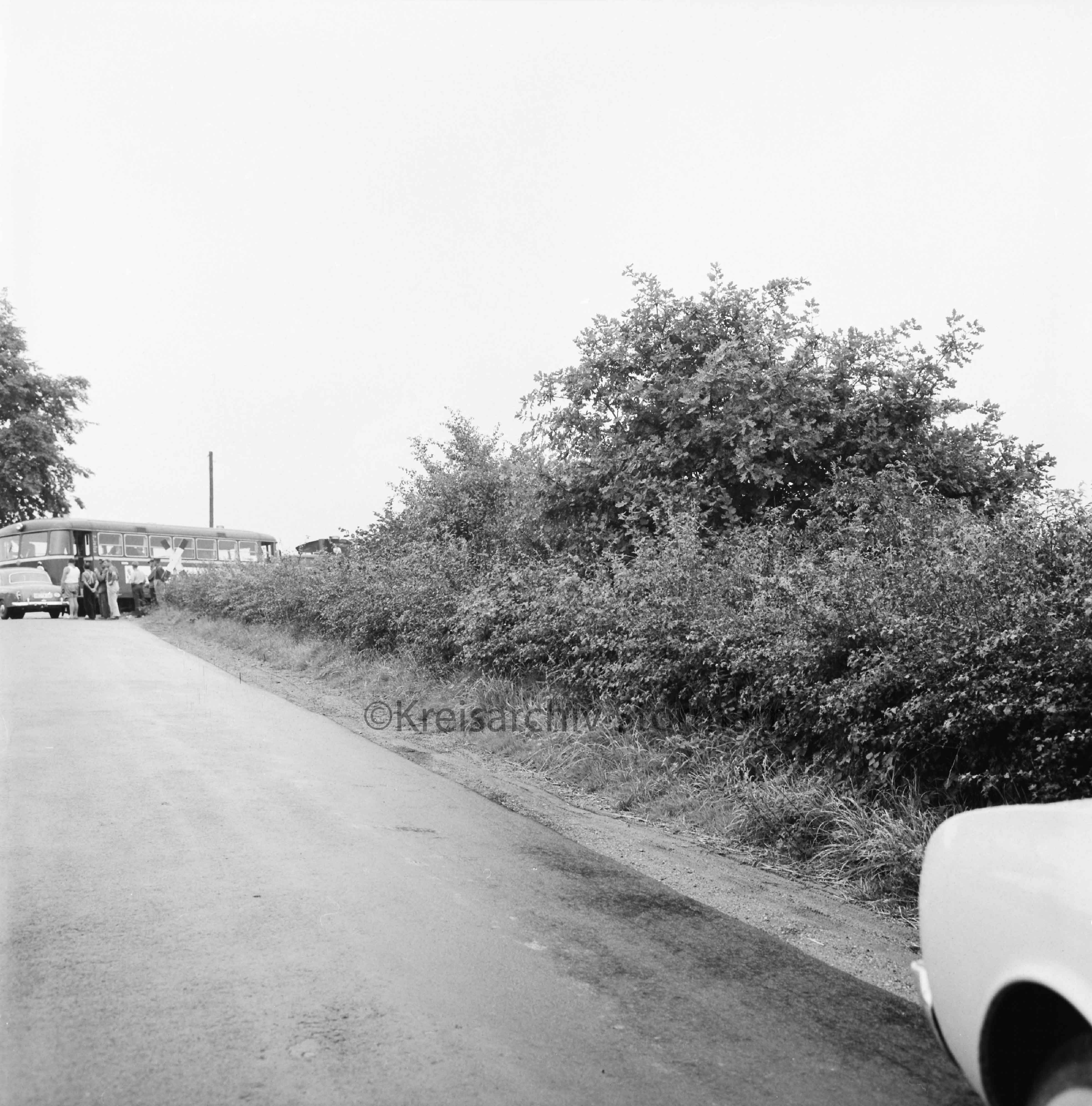 Dieses Bild zeigt einen Unfall am Bahnübergang Rümpeler Weg aus dem Jahre 1963. Beteiligt waren ein Uerdinger Schienenbus der EBOE und ein PKW der Marke Mercedes Benz. Der PKW hat nach dem Unfall nur noch Schrottwert während der Triebwagen nur wenig Schaden genommen hat.