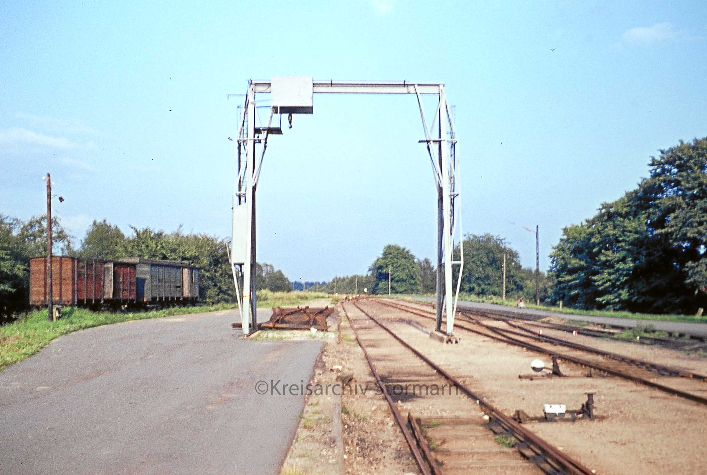Bf Nahe Gleisanlagen Ladekran abgestellte G-Wagen 1973