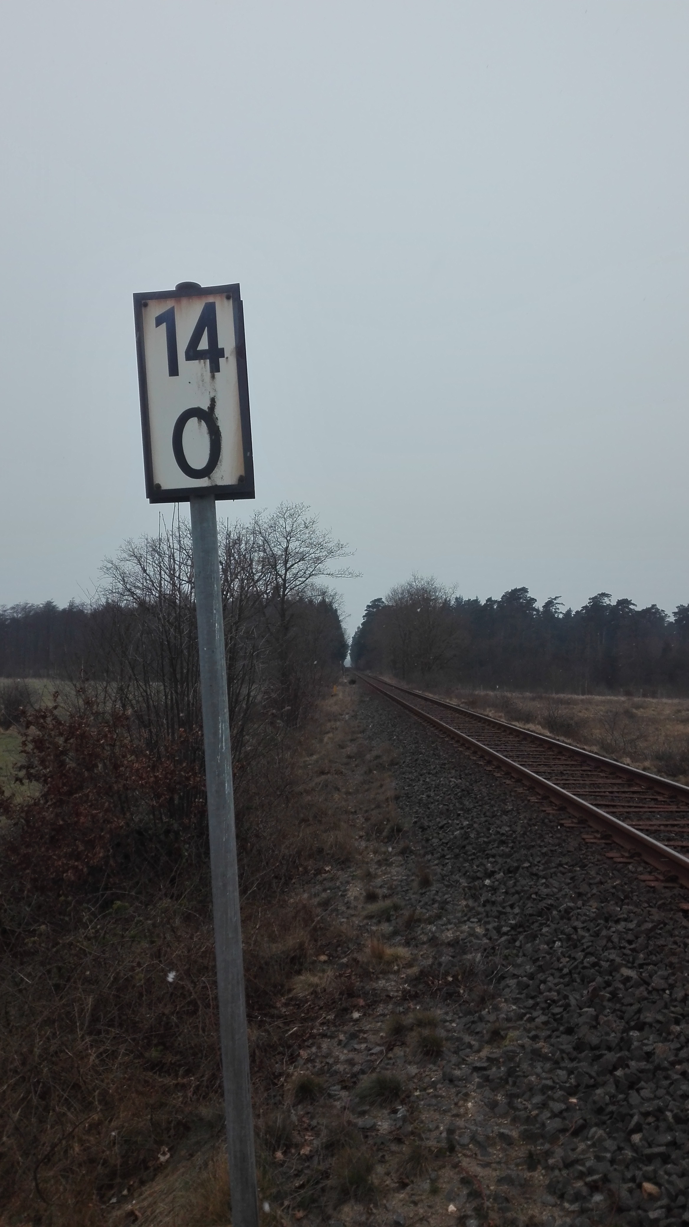 Blick auf die Kilometertafel 14km kurz hinter den Heeder Tannen in Richtung Langeln.