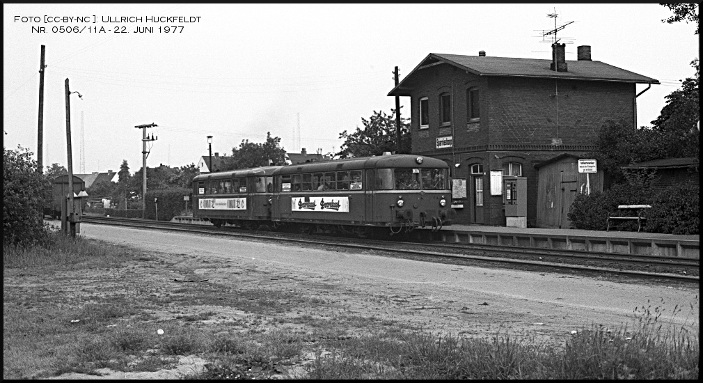 Am 22. Juni 1977 verkehren VT 3.08 und VT 3.10 als Zug 414 von Barmstedt nach Elmshorn. Die Aufnahme von Ullrich Huckfeldt zeigt den Zug beim Halt im bf Sparrieshoop.