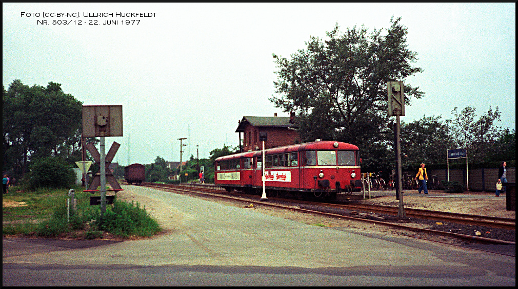 Am 22. Juni 1977 verkehren VT 3.08 und VT 3.10 als Zug 414 von Barmstedt nach Elmshorn. Die Aufnahme von Ullrich Huckfeldt zeigt den Zug beim Halt im Bf Sparrieshoop.
