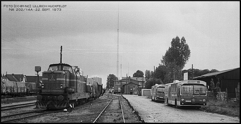 Reger Güterverkehr am 22. September 1973 im Bf Ulzburg. Hier kreuzen sich die AKN und die EBOE. Rechts im Bild stehen Busse mit dem Fahrtziel Wakendorf, denn der Personenverkehr wurde zwischen Ulzburg und Oldesloe im September 1973 eingestellt. Das Bild wurde am 22. September 1973 von Ullrich Huckfeldt aufgenommen.