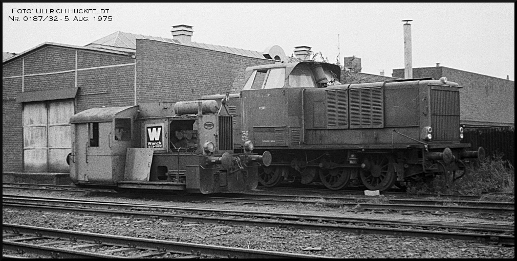 Die ehemaligen Diesellokomotiven V 3.021 (Köf) und V 3.022 (MaK) stehen am 5. August 1975 im AKN Bw Billbrook bereits für immer auf dem Abstellgleis. Die MaK Lok V 3.022 kam zur AKN und wurde dann nach einem Unfall abgestellt.