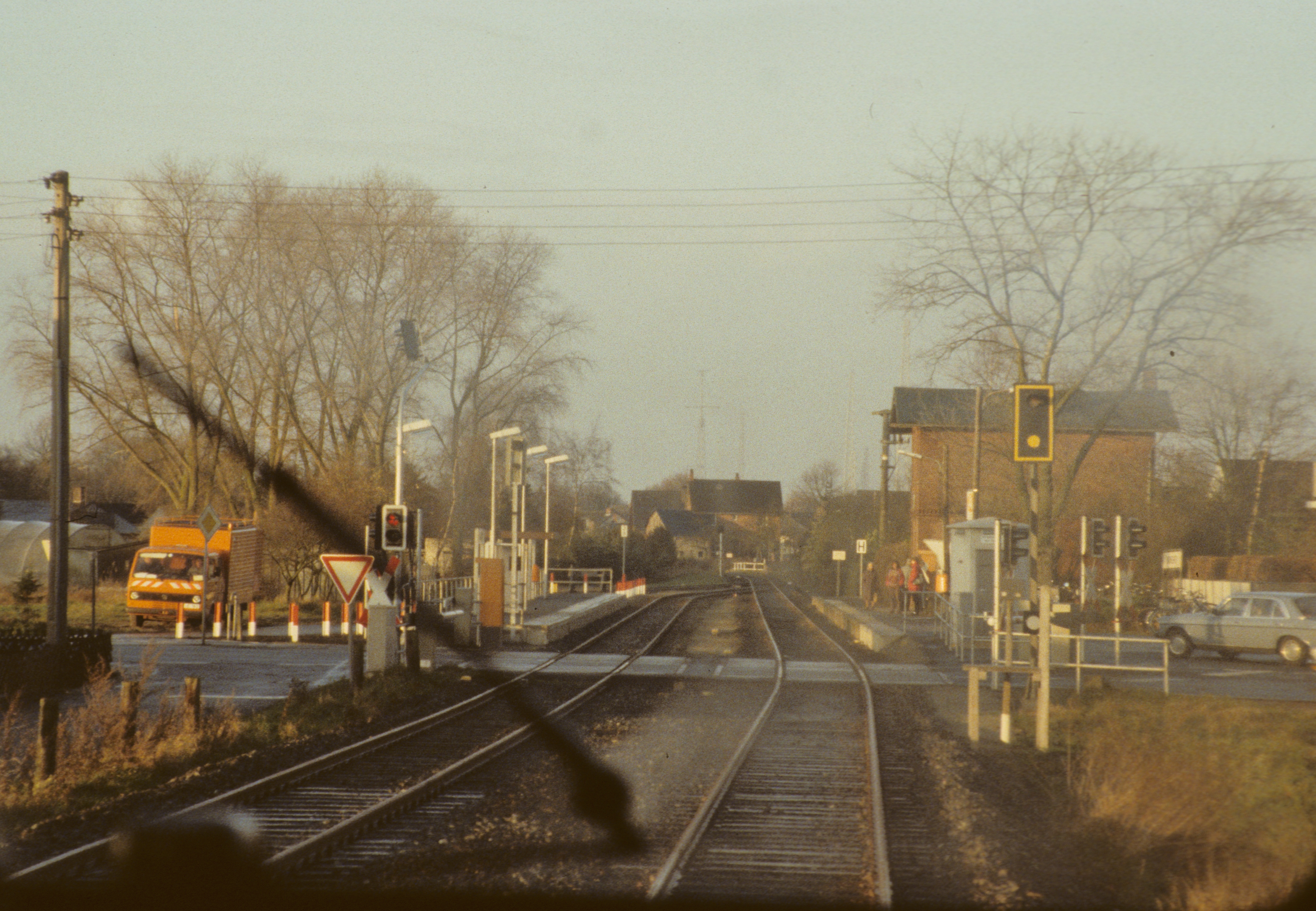 Blick nach vorne aus einem Uerdinger Schienenbus auf den Bahnhof Sparrieshoop. Der Zug nähert sich dem Bahnhof Sparieshoop auf der Fahrt von Barmstedt nach Elmshorn am 18. November 1986. Die Zugkreuzungen erfolgt hier durch Rückfallweichen, so dass zwei Züge die eingleisige Strecke zwischen Elmshorn und Barmstedt befahren können.