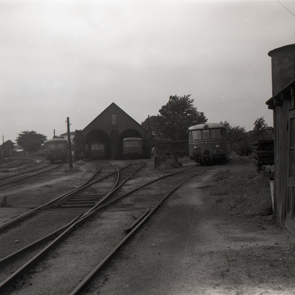 Bild vom Lokschuppen des Bw Barmstedt vom Bahnhof aus betrachtet. Die Aufnahme aus dem August 1966 zeigt den MAN Triebwagen VT 26 (später VT 3.06) neben dem Lokschuppen sowie den Créde VT 24 (später VT 3.04) und den Uerdinger VT 27 (später VT 3.07) im Lokschuppen. Links neben dem Schuppen auf dem Abstellgleis steht der Steuerwagen VS 21 (später VS 3.51). Aufnahme von Jörn Schramm aus dem August 1966.