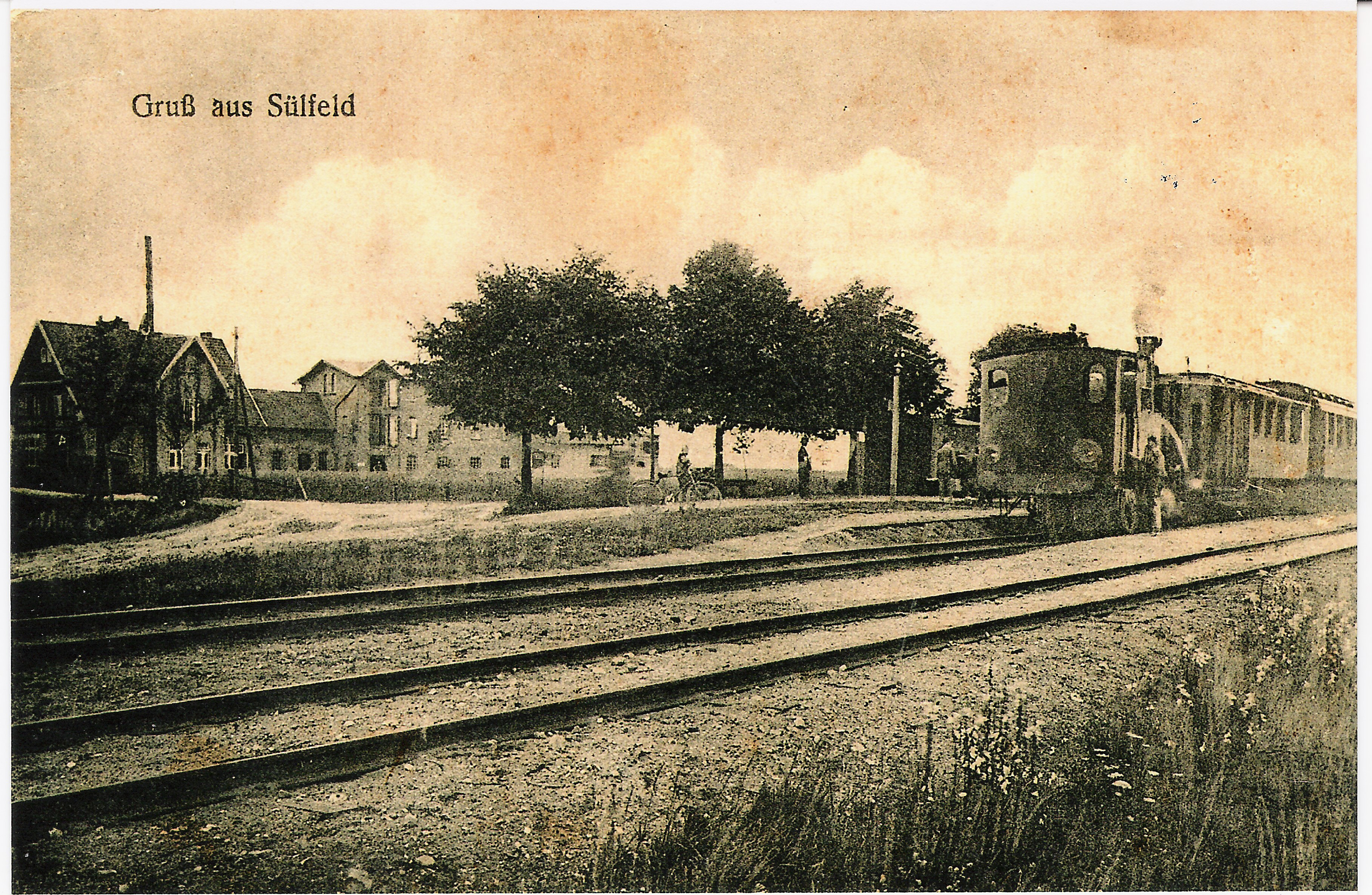 Diese Postkarte stammt vermutlich aus der Zeit um 1910. Die Strecke war 1907 in Betrieb gegangen und zeigt einen Personenzug im Bf Sülfeld.