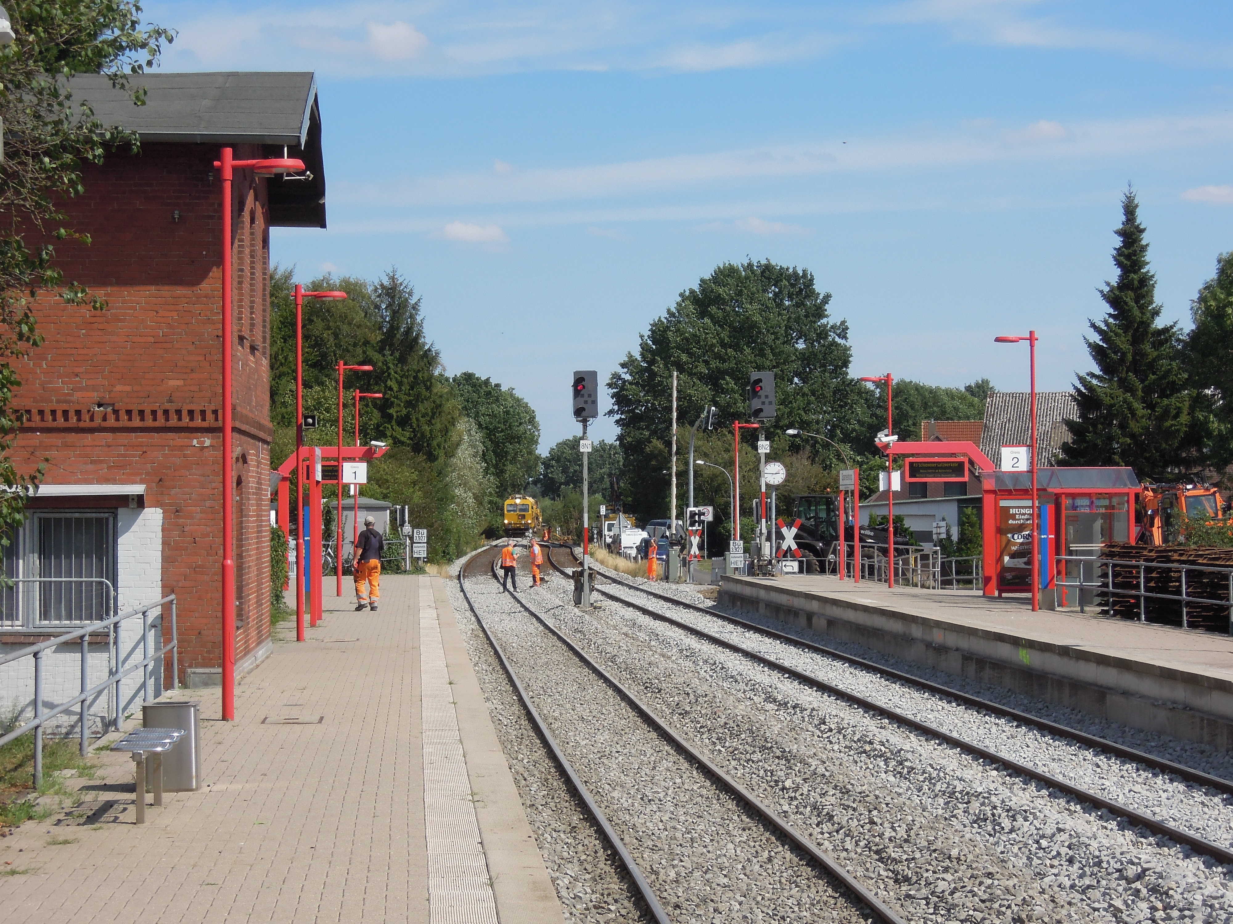 Blick auf die neuen Gleise im Bf Sparrieshoop in Richtung Barmstedt. Hinter dem Bü Rosenstraße befindet sich die Stopfmaschine auf dem nördlichen Gleis. 18. August 2018
