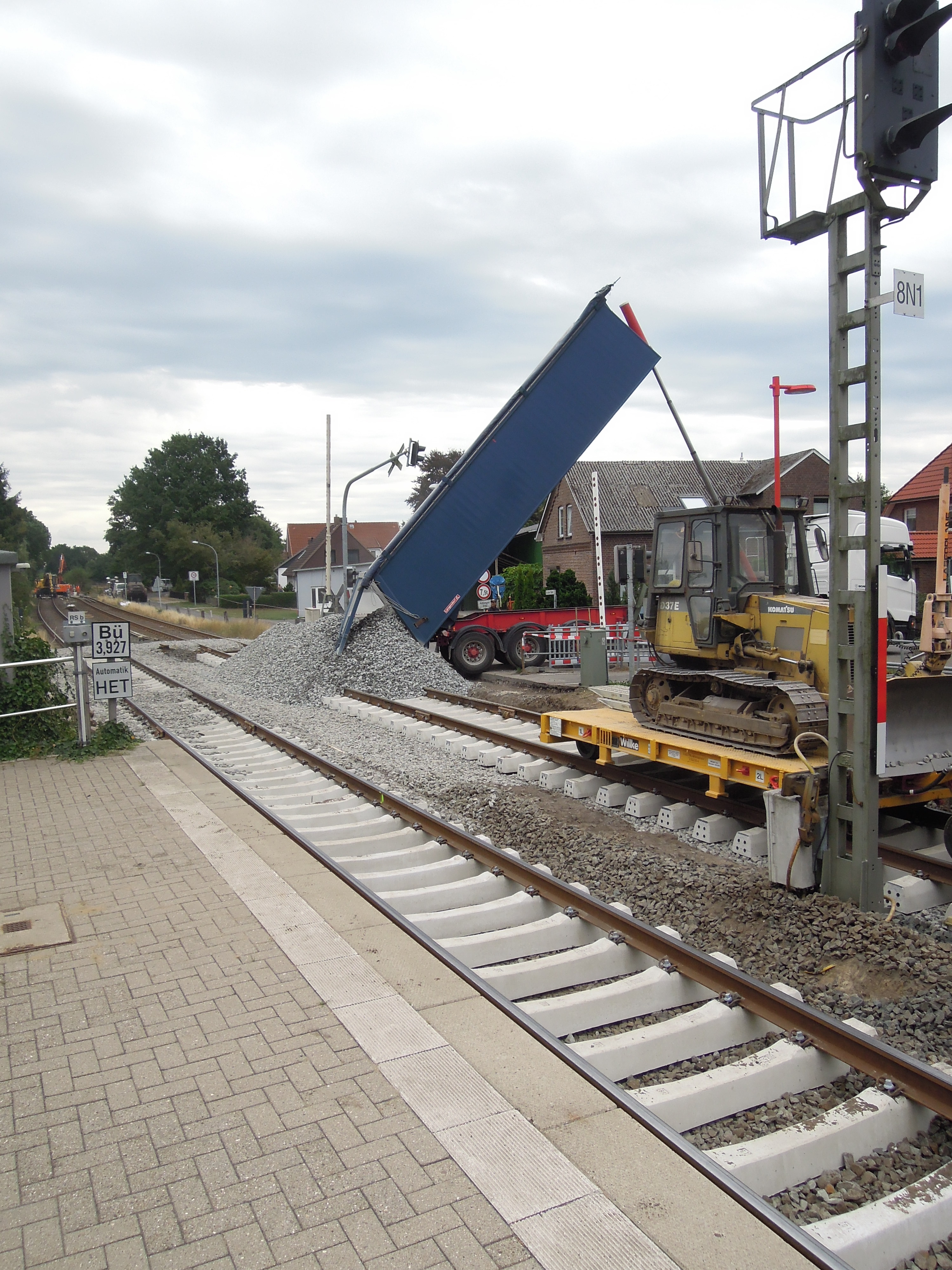 Ein LKW lädt frischen Schotter am Bü Rosenstraße in Sparrieshoop ab. 17. August 2018