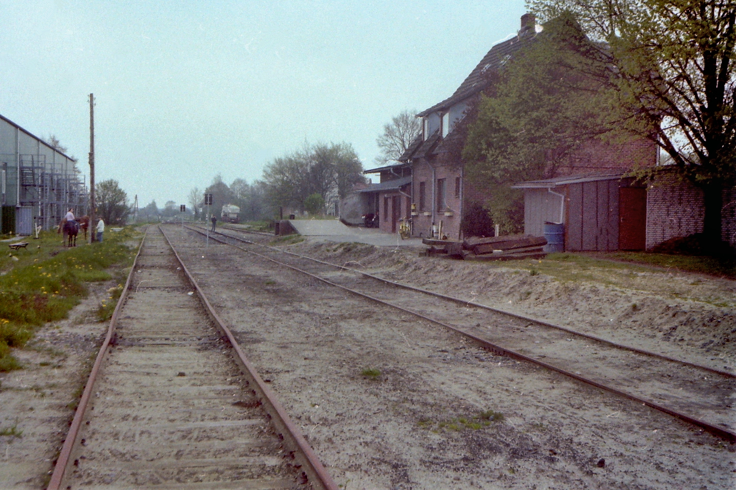 Diese Aufnahme zeigt den Bf Alveslohe im Mai 1983. Der Blick des Fotografen ist in Richtung Osten nach Ulzburg gerichtet. Der Zustand der Gleise ist desolat. Es ist schwer vorstellbar, dass hier zeitweise noch Zugverkehr stattfand.