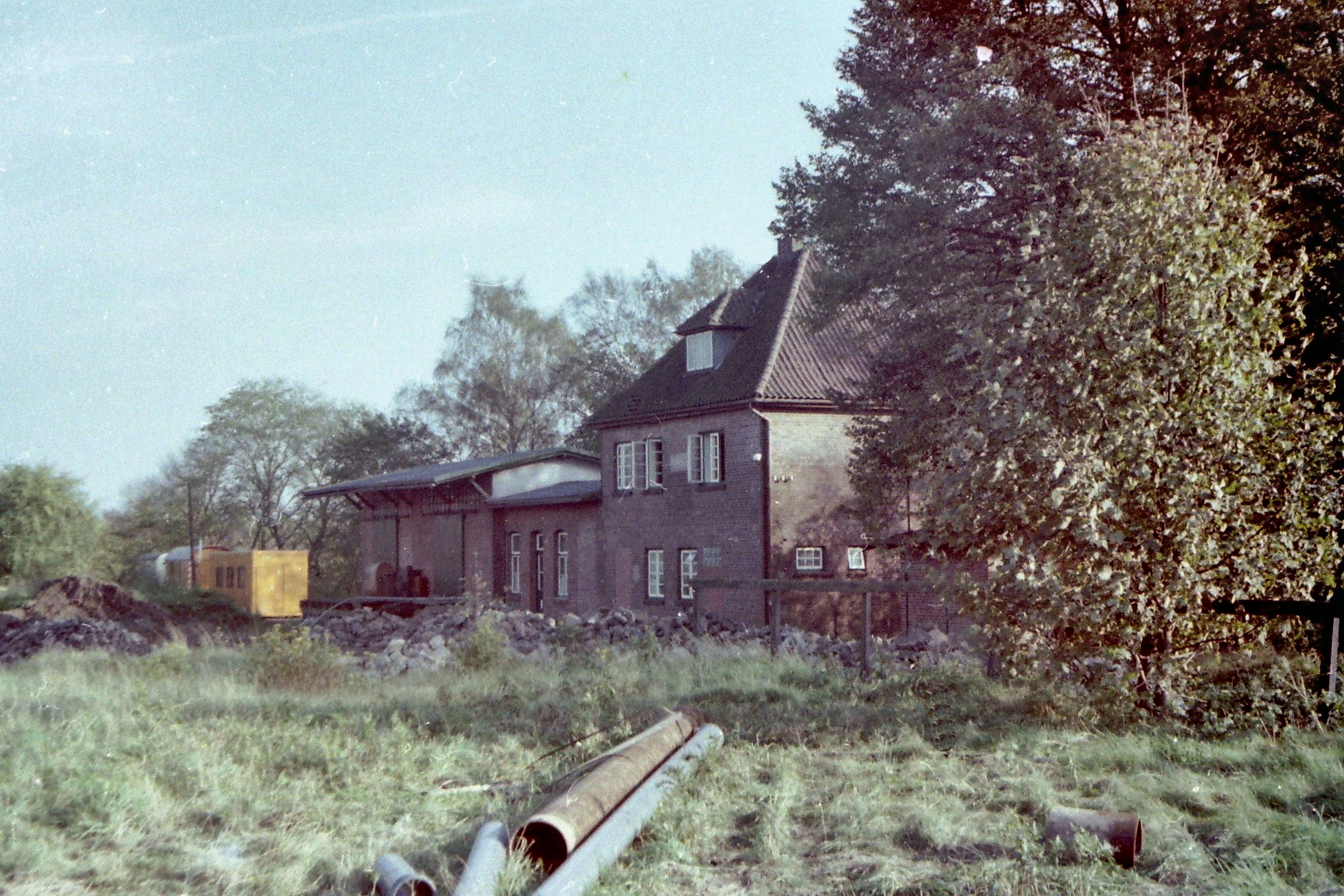 Das Bahnhofsgebäude von Nahe hatte einen abweichenden Baustil und dürfte aus der Zeit um 1930 stammen. Vermutlich war das Original ähnlich wie Sülfeld und hatte sich für den Bahnhof mit seinen langen Überholungsgleisen als zu klein erwiesen. Die Aufnahme entstand am 17. Oktober 1981.
