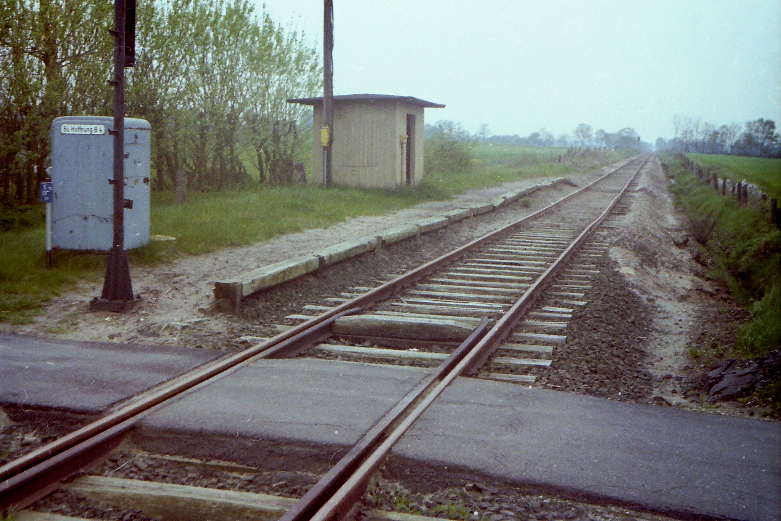 Das Bild zeigt den Hp Hoffnung mit Blick in Richtung Barmstedt im Mai 1983. Im Bereich des Bü mit der Bundesstraße B4 gab es Holzschwellen in Schotterbettung, aber bereits im Bereich der aus alten Bahnschwellen errichteten Bahnsteigkante, beginnt die typische Bettung in Sand. Nur die Schienenstöße sind in Schotter gebettet.