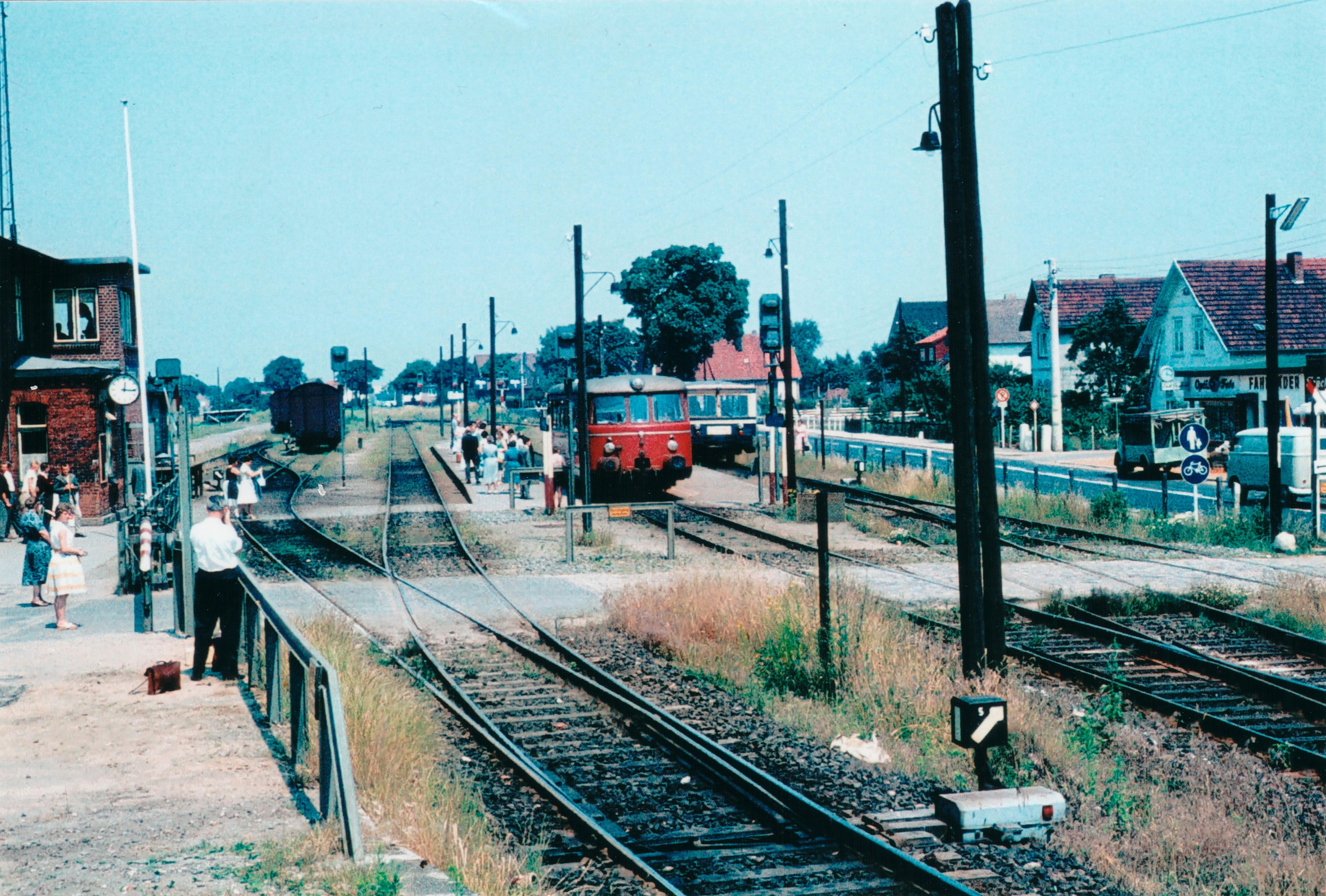 Der Bahnhof Ulzburg mit dem Gotha Triebwagen VT 3.03 der EBOE auf Gleis 1 und einem MAN Triebwagen der AKN auf Gleis 2. Aufnahme aus den 1960er Jahren.