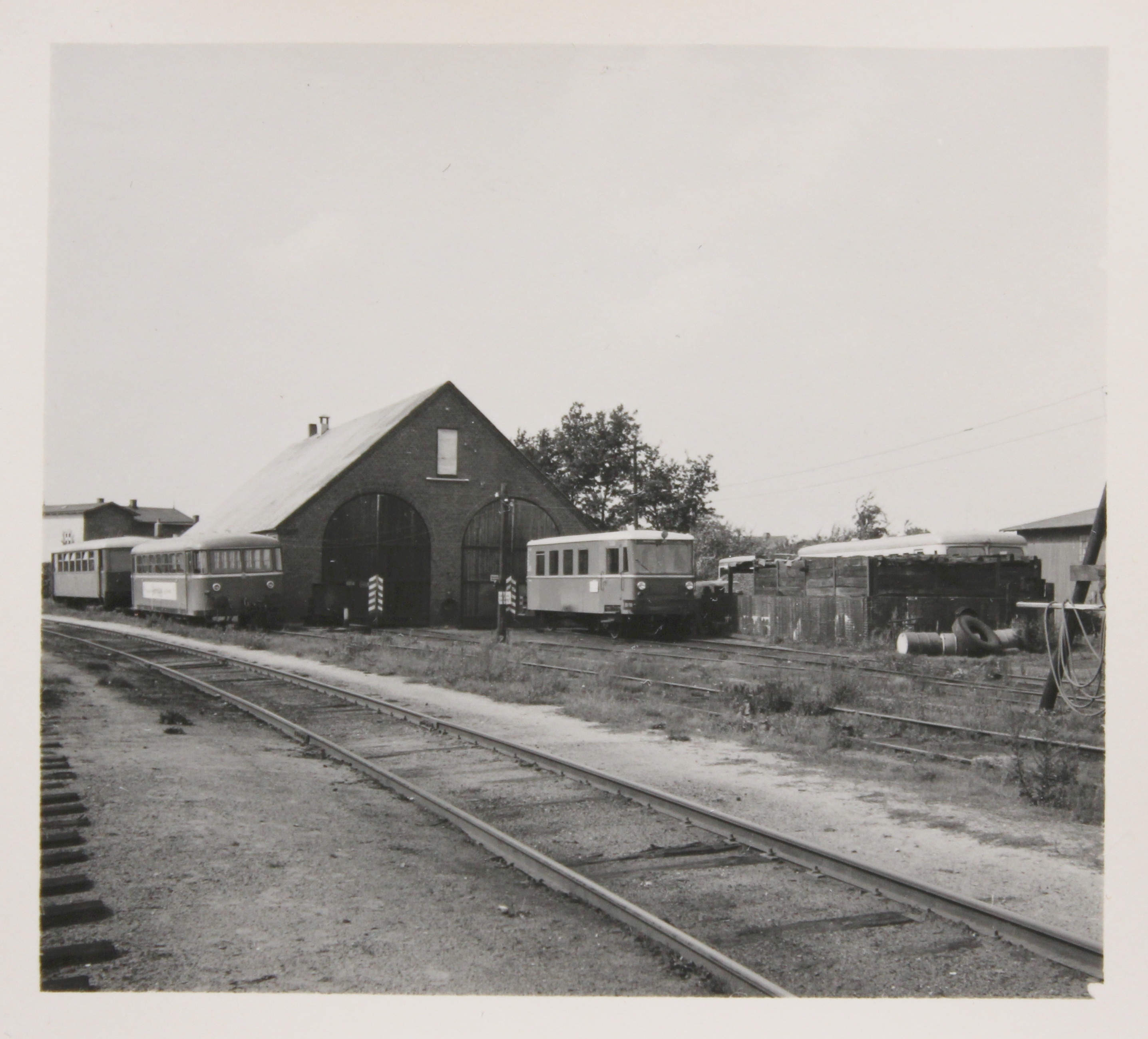 Dieses Bild zeigt den Gotha Triebwagen VT 3.03 vor dem Lokschuppen des Bw Barmstedt. Links neben dem Schuppen der Steuerwagen VS 21 (später VS 3.51). Rechts hinter dem Kohlebansen der MAN Triebwagen VT 25 (ex T5). Aufnahme aus dem September 1963.