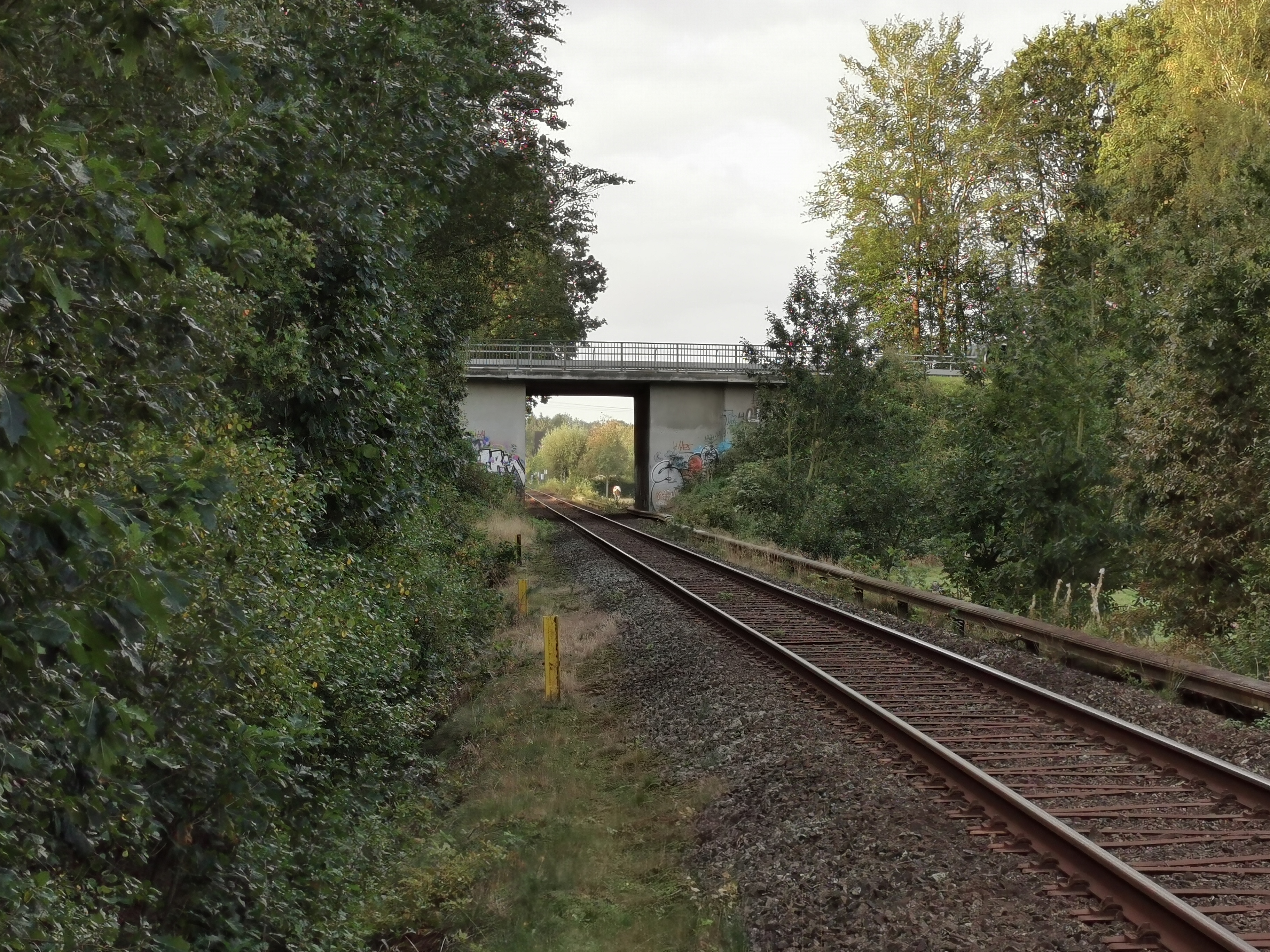 Die Strecke zwischen Sparrieshoop und Langenmoor in Sibirien. Im Hintergrund ist die Brücke über die ehemalige B5 (heute Wittenberger Straße) zu sehen. Am Fotostandort befand sich früher der Hp Sibirien von dem keine Reste mehr zu erkennen sind. Die Aufnahme entstand am 19. September 2019.