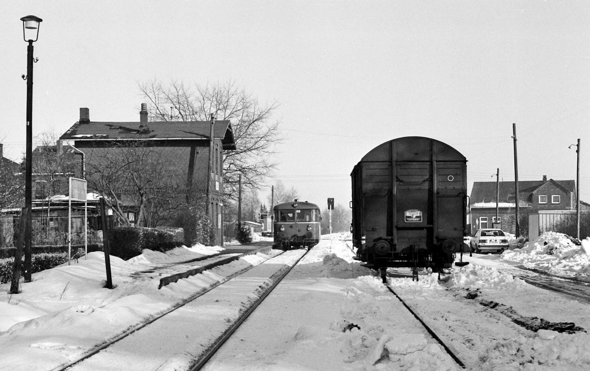 VT 3.10 hält am 10.02.1979 im Bahnhof Sparrieshoop. Damals gab es noch Güterverkehr, wie der im Ladegleis stehende G-Wagen belegt