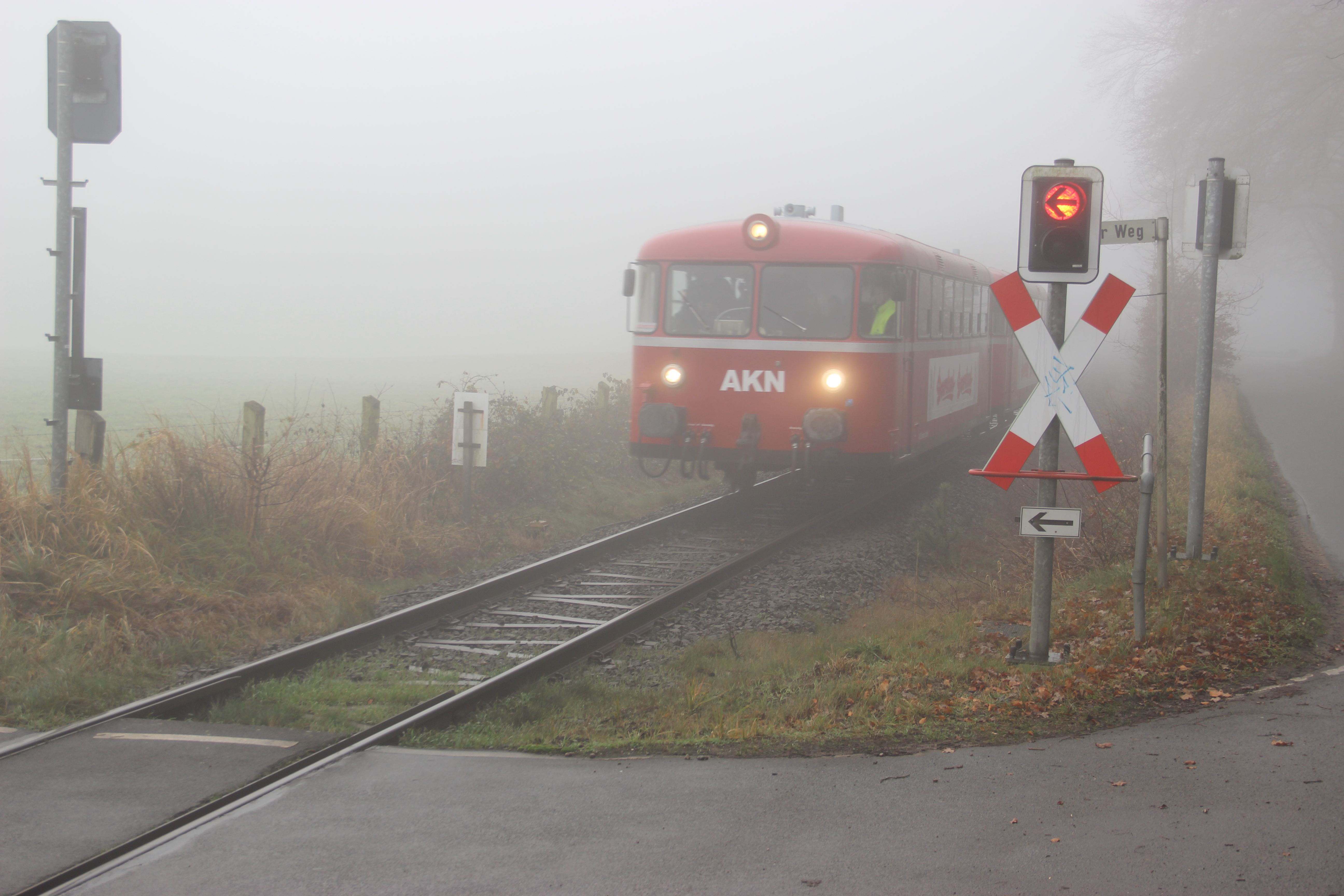 Während der Abschiedsfahrten für VT 3.08 und VT 3.09 am 1. Dezember 2019 passiert der Sonderzug den Bü Offenauer Weg im dichten Nebel.