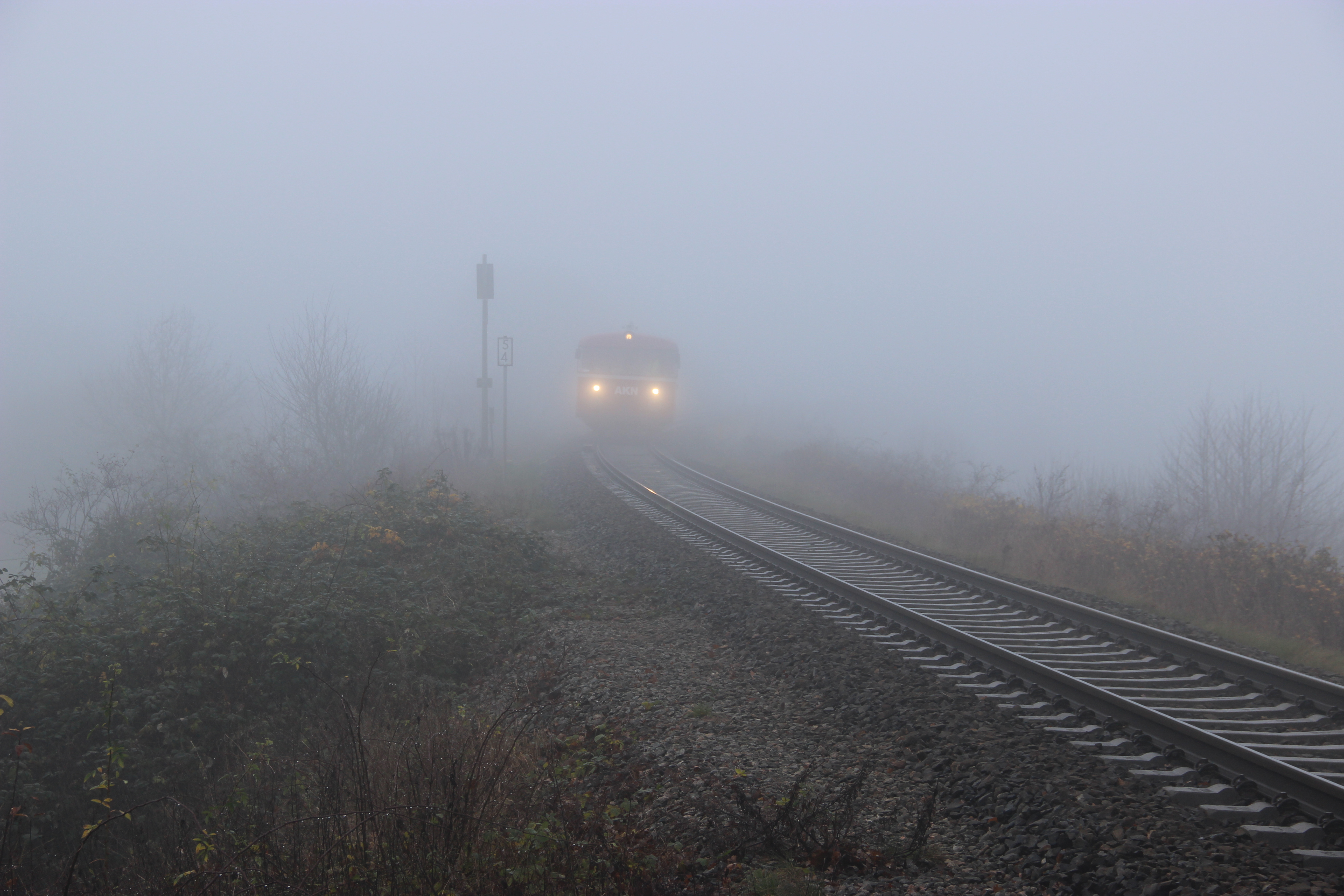 Während der Abschiedsfahrten der AKN für die Triebwagen VT 3.08 und VT 3.09 am 1. Dezember 2019 taucht der Sonderzug aus Richtung Sparrieshoop kommend aus dem Nebel auf und fährt weiter über den Hp Bokholt nach Barmstedt.