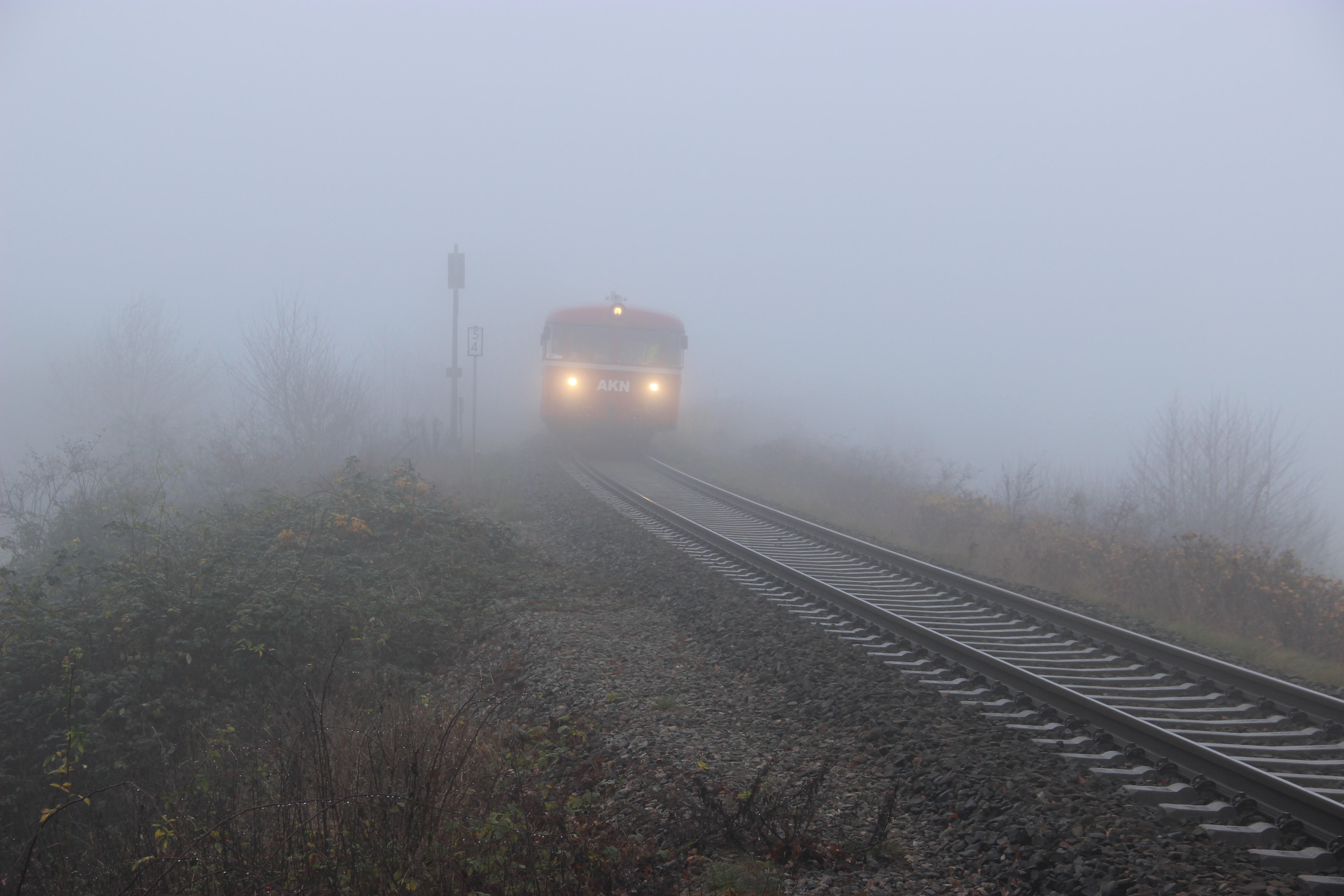 Während der Abschiedsfahrten der AKN für die Triebwagen VT 3.08 und VT 3.09 am 1. Dezember 2019 taucht der Sonderzug aus Richtung Sparrieshoop kommend aus dem Nebel auf und fährt weiter über den Hp Bokholt nach Barmstedt.