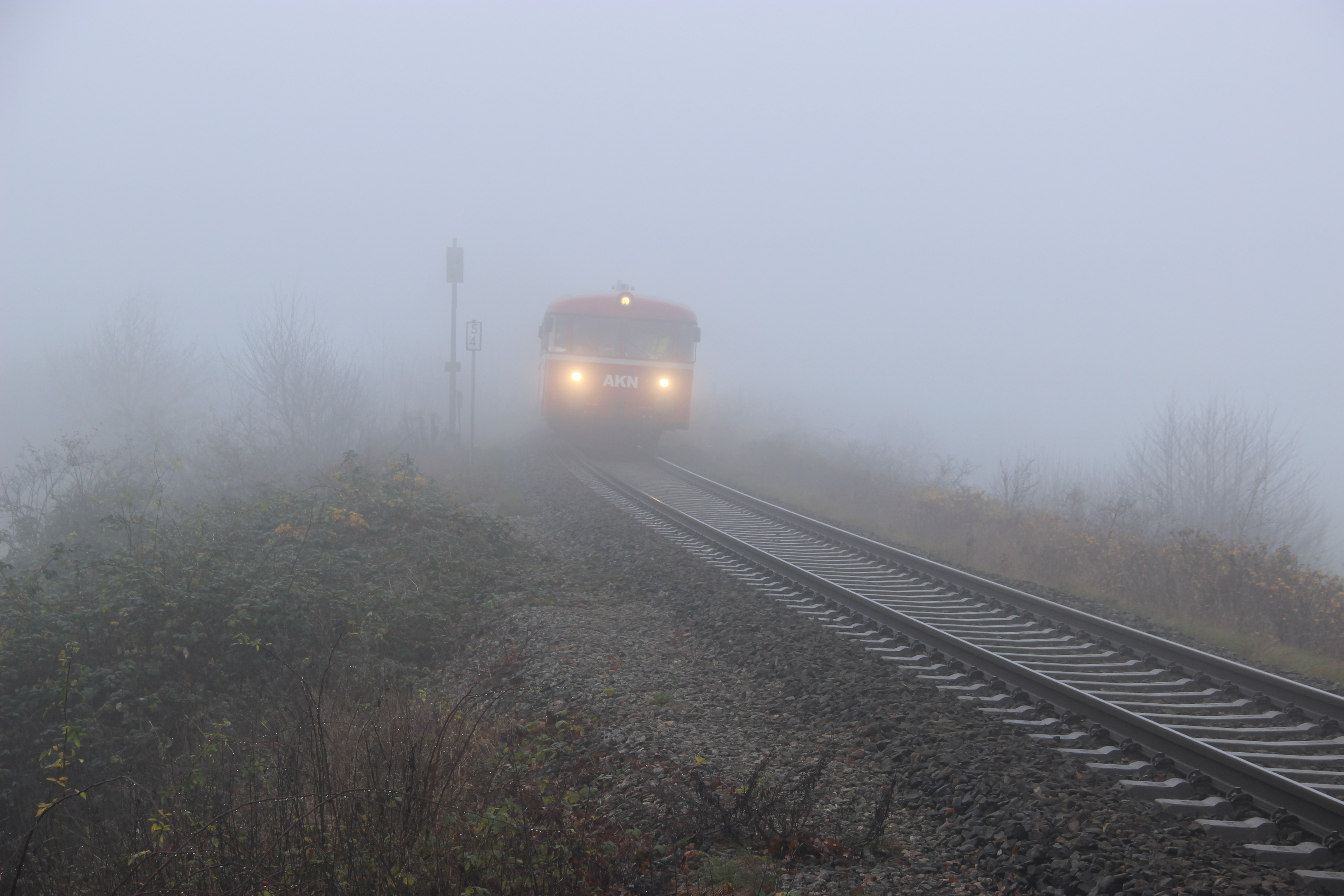 Während der Abschiedsfahrten der AKN für die Triebwagen VT 3.08 und VT 3.09 am 1. Dezember 2019 taucht der Sonderzug aus Richtung Sparrieshoop kommend aus dem Nebel auf und fährt weiter über den Hp Bokholt nach Barmstedt.