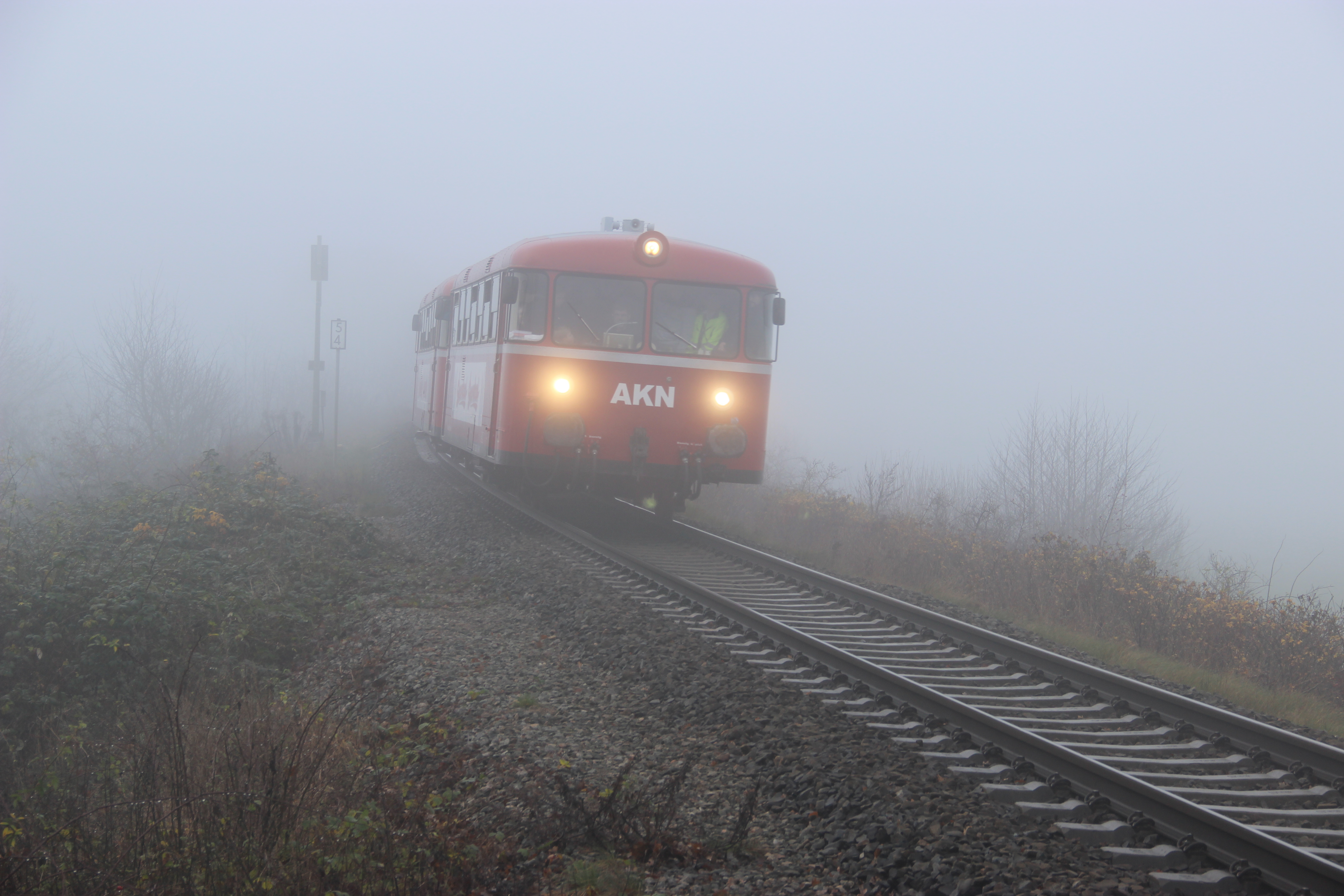 Während der Abschiedsfahrten der AKN für die Triebwagen VT 3.08 und VT 3.09 am 1. Dezember 2019 taucht der Sonderzug aus Richtung Sparrieshoop kommend aus dem Nebel auf und fährt weiter über den Hp Bokholt nach Barmstedt.