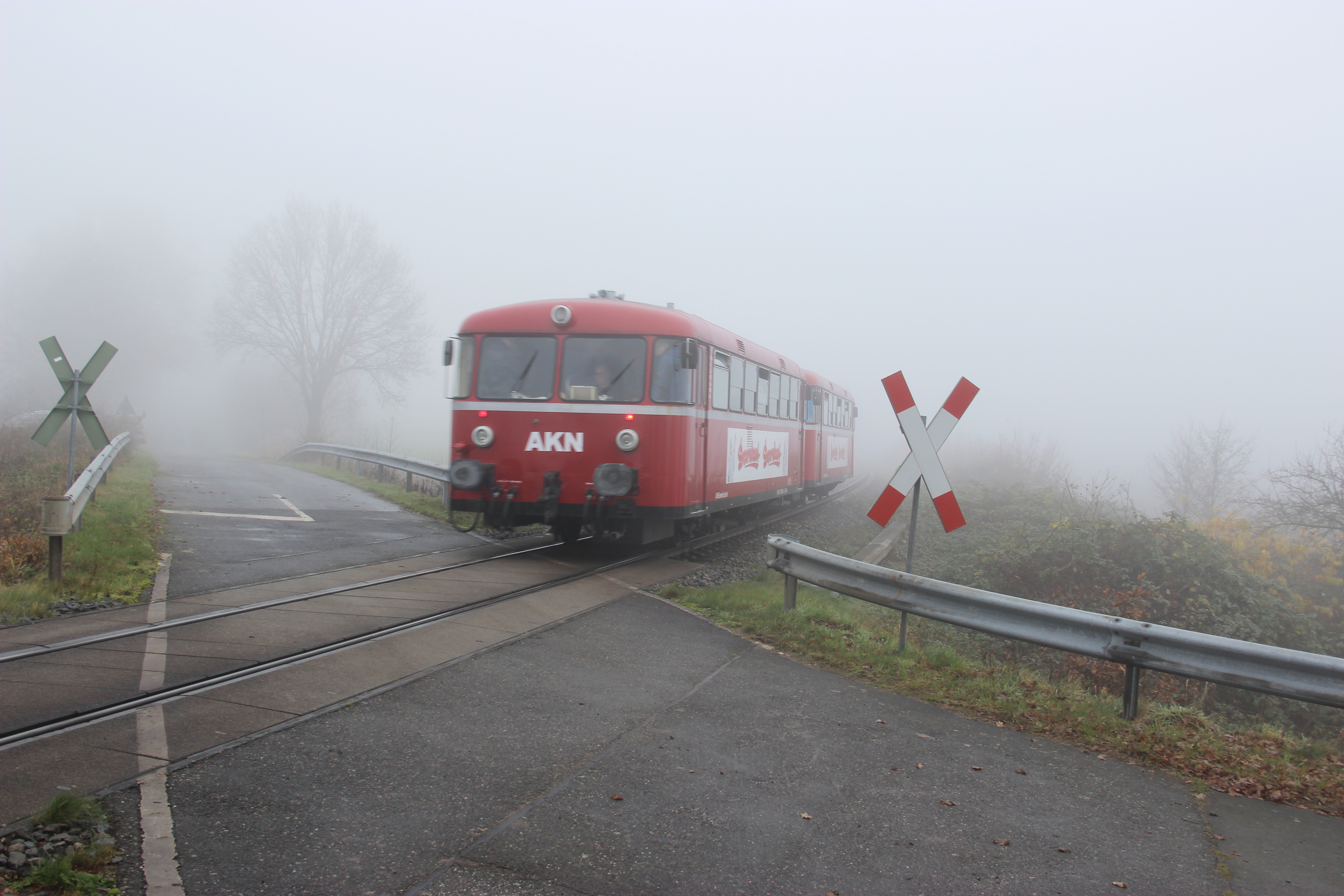 Während der Abschiedsfahrten der AKN für die Triebwagen VT 3.08 und VT 3.09 am 1. Dezember 2019 taucht der Sonderzug aus Richtung Sparrieshoop kommend aus dem Nebel auf und fährt weiter über den Hp Bokholt nach Barmstedt.