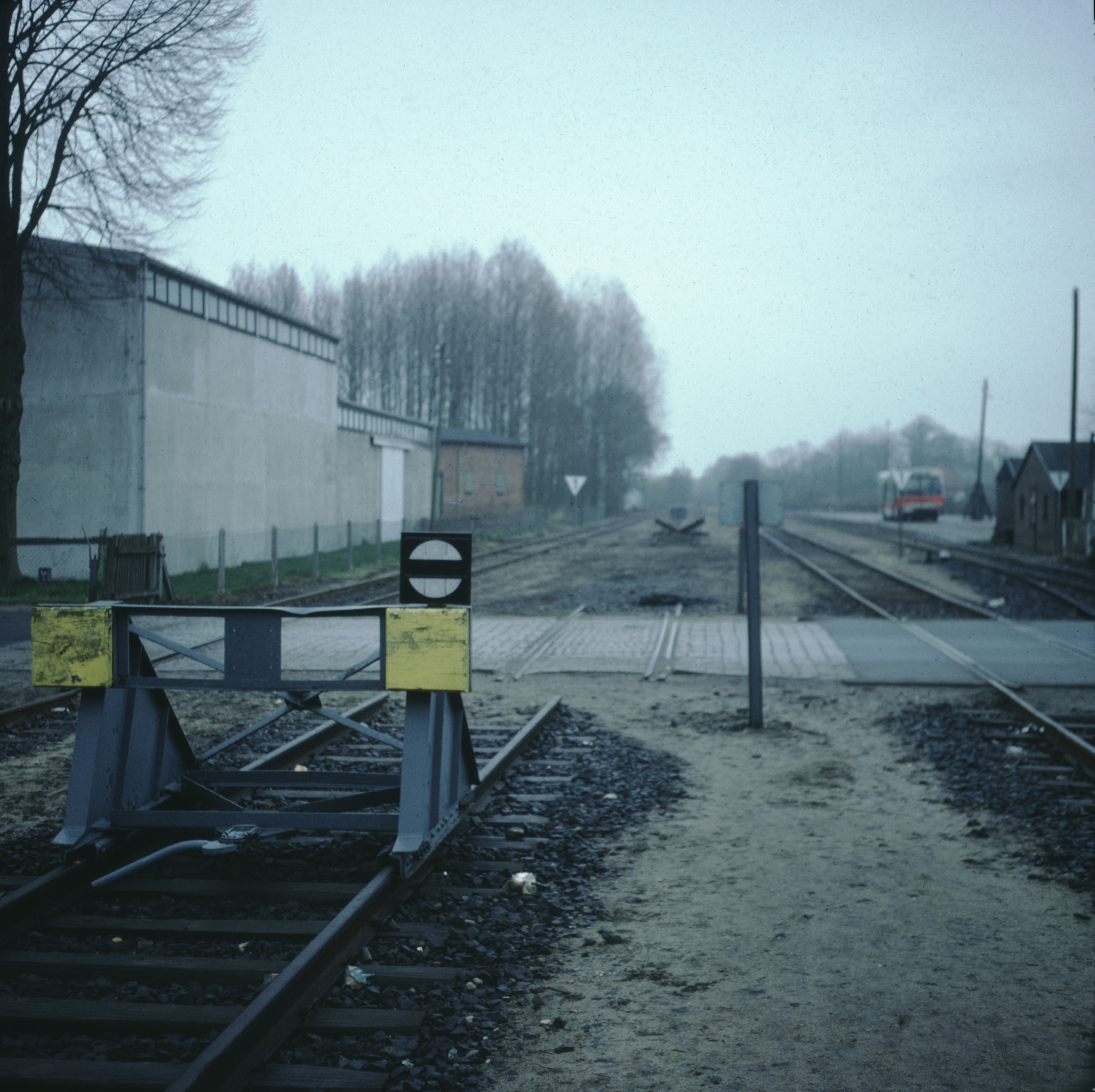 Dieses Bild zeigt den Blick aus dem Bf Barmstedt in Richtung Langeln. Links vorne im Bild schließt der Prellbock das Gleis 2 ab. Das Gleis 2 ist unterbrochen, weil das Gleis im Bereich des Bahnhofs weiter nach Norden verlegt worden ist, um Platz für den breiteren Bahnsteig zu bekommen. Im Bereich des Bahnübergangs Nappenhorn ist gut zu erkennen, dass das Gleis ursprünglich weiter südlich lag. Im Hintergrund wartet ein Bus auf Fahrgäste in Richtung Osten. Zu diesem Zeitpunkt war der Personenverkehr östlich von Barmstedt bereits eingestellt. Die Aufnahme entstand am 21. April 1979.