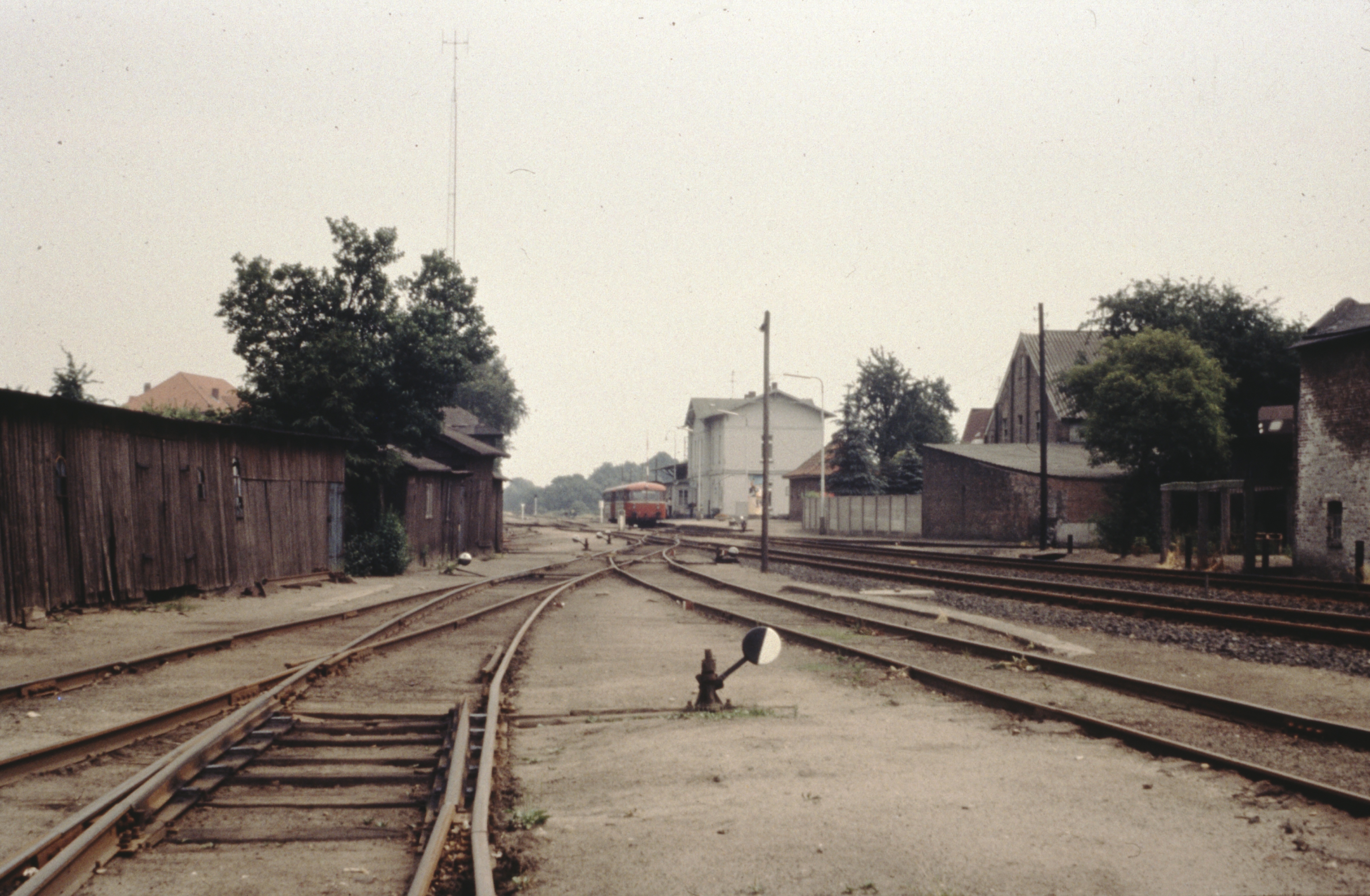 Blick vom Lokschuppen in Barmstedt über die Gleisanlagen in Richtung Oldesloe. Rechts im Hintergrund das große Bahnhofsgebäude.