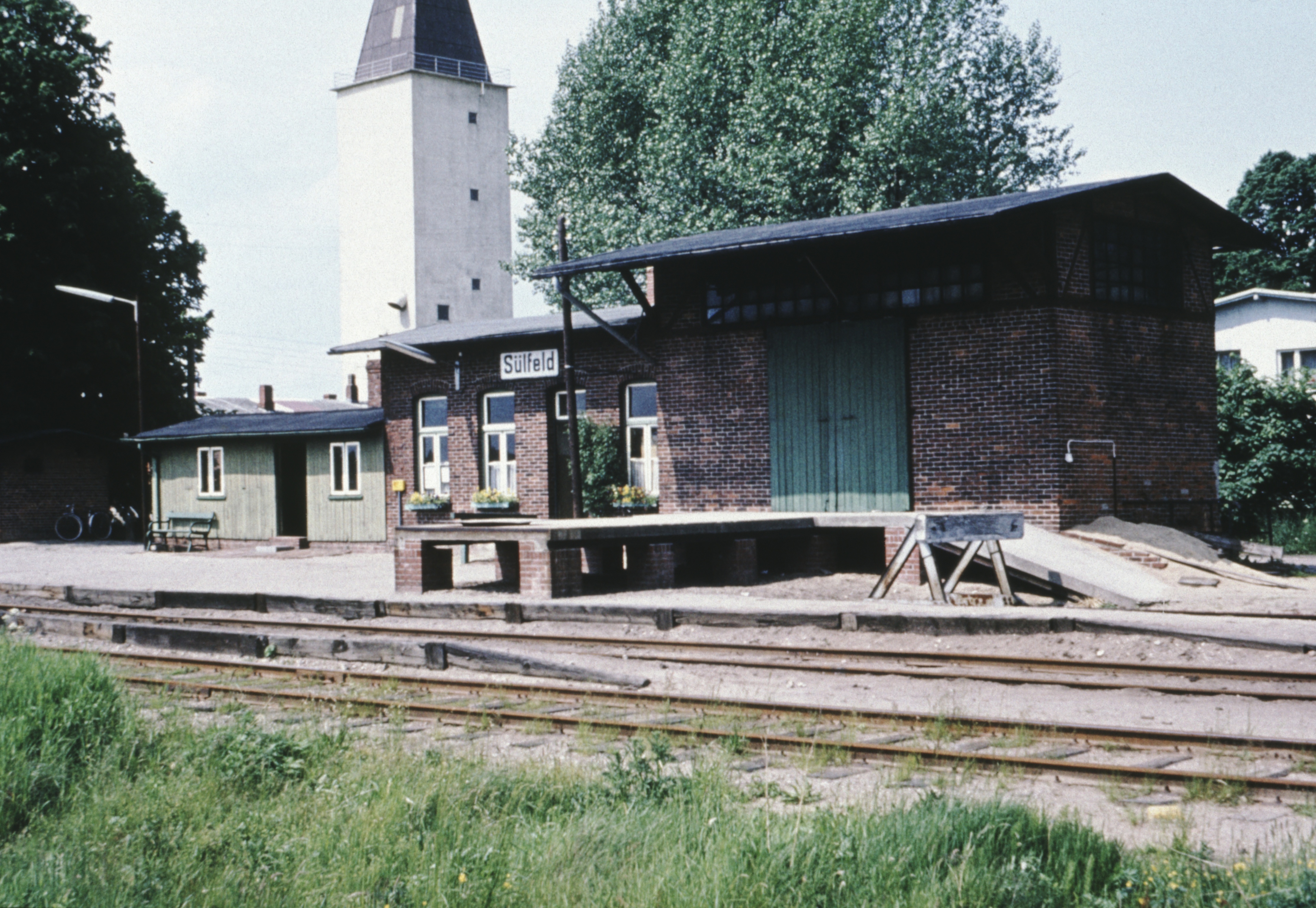 Der Bf Sülfeld mit dem für viele Bahnhöfe typischen Güterschuppen. Die Aufnahme stammt vermutlich aus den 1960er Jahren.