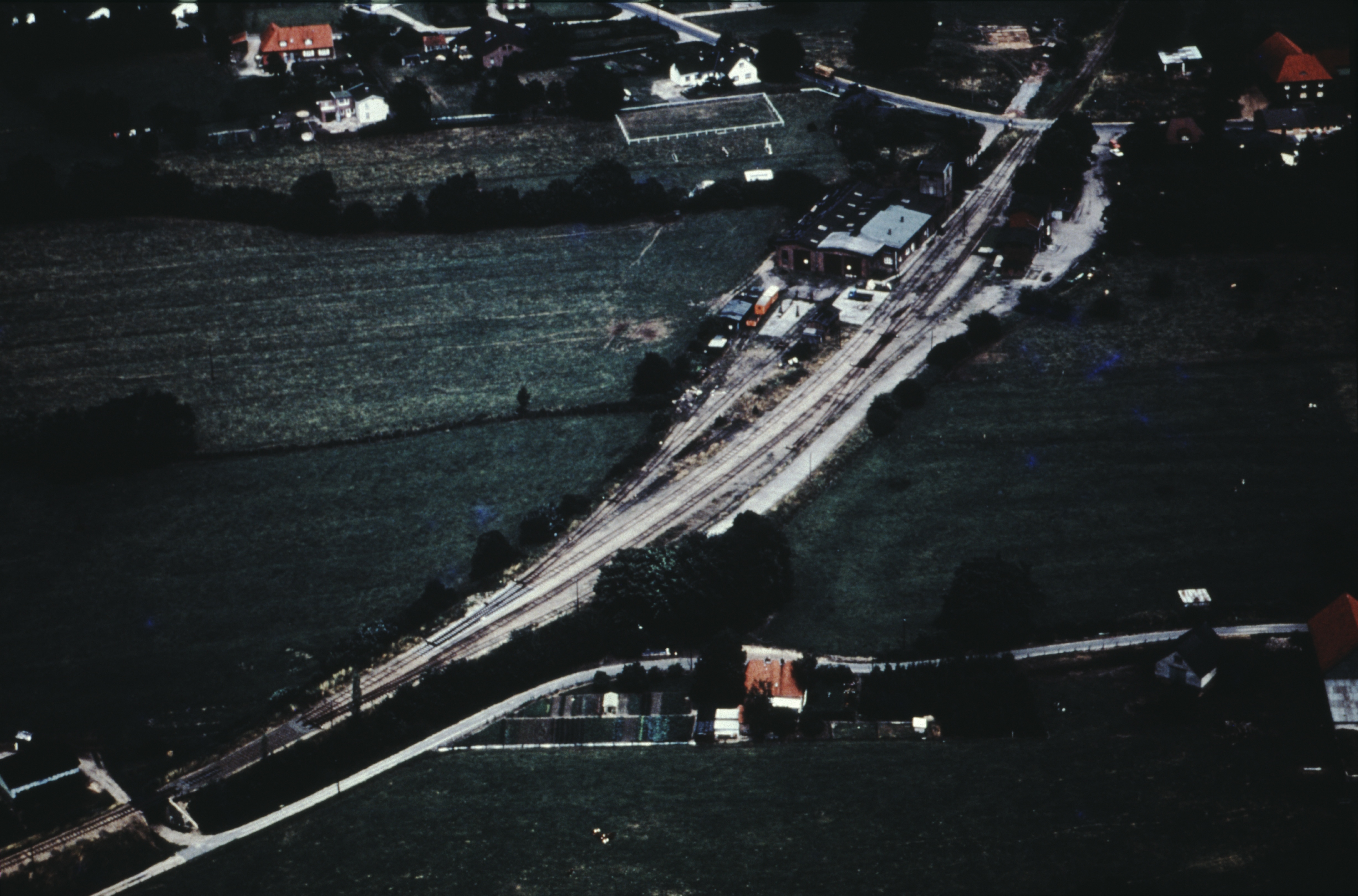 Luftbildaufnahme vom Bw Wakendorf-Götzberg aus den 1960er Jahren. Die Aufnahme zeigt das Bw von Süd-Westen. Vorne links die Ausfahrt nach Ulzburg. Rechts der Gleise im Hintergrund das Bahnhofsgebäude. Links der Gleise in der Bildmitte das Bw.