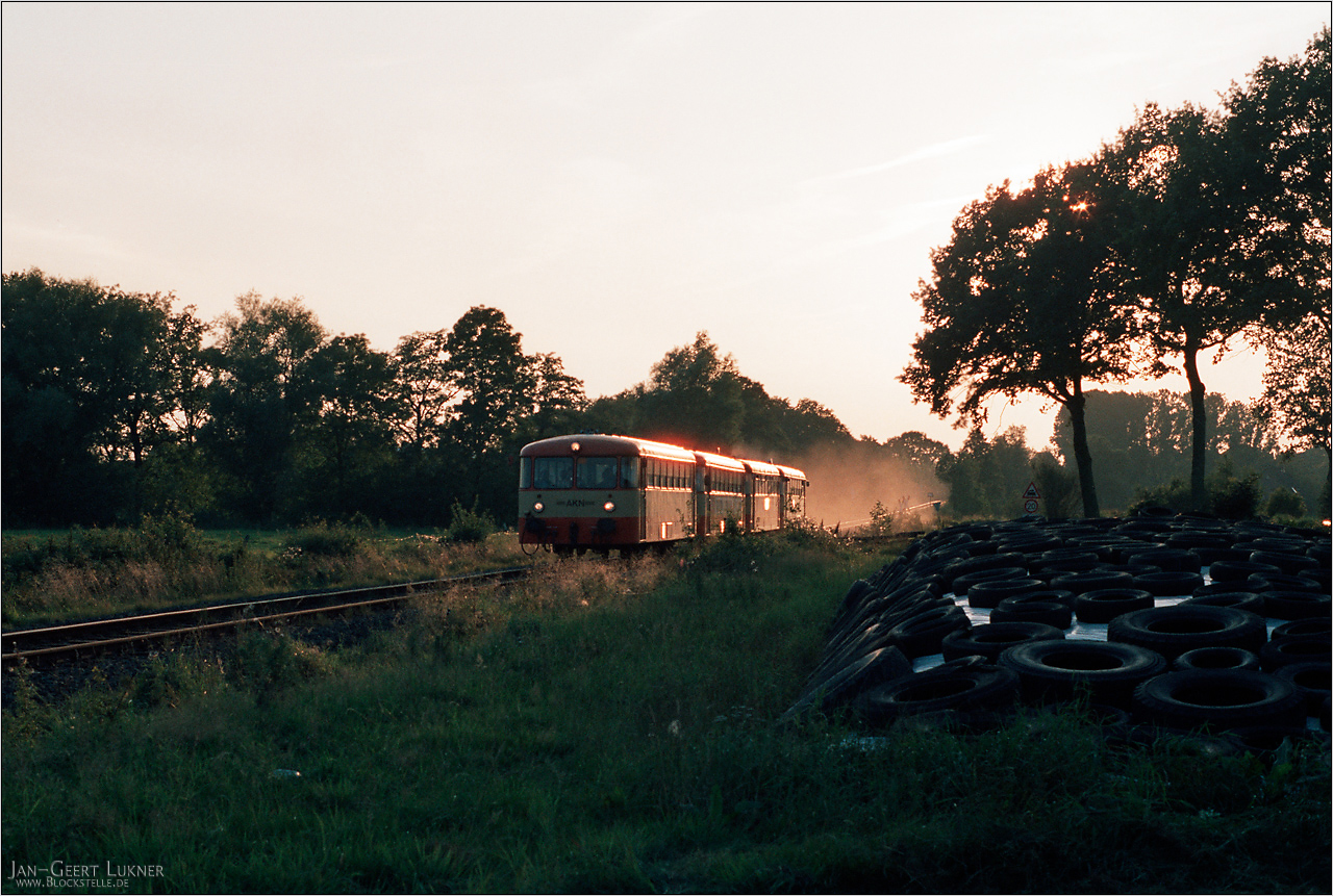 07.09.1993: Jahrelang hat man sich um die "EBOE" nicht gekümmert. Man fängt immer erst an, wenn irgendwas zuende geht. Nun ging es mit den Schienenbussen zuende. Die AKN hatte neue VTA beschafft und konnte damit VT2E für die A3 freisetzen. Also gab es mal wieder eine Tour dorthin. Und auch wenn man es nicht allen Bildern ansieht, ja, es war eine gezielte Fototour. Warum die nur nachmittags stattfand, als das Licht fast überall an der A3 arg spitz stand - ich habe keine Ahnung. Aber paar Andenkenaufnahmen, die ich heute nicht missen möchte, sind doch zustande gekommen. Dabei hatte ich mich mit dem Zug ostwärts bewegt. Erst Sparrieshoop, dann Voßloch, dann Barmstedt. Denn es gab ein Novum, eine Strecken-Wiedereröffnung: Mit ganzen drei Zugpaaren an Mo-Fr bzw einem Paar an Sa wurde jetzt wieder der Abschnitt Barmstedt - Ulzburg befahren. Die Fahrten dienten einzig und allein der Anbindung der Fahrzeuge an die Werkstatt in Kaltenkirchen, da die EBOE-Werkstatt in Barmstedt geschlossen worden war. Sie waren allerdings als Fußnote unter der Fahrplantabelle 139 (Elmshorn - Barmstedt) veröffentlicht und konnten zur Mitfahrt genutzt werden.Nach Verlassen des Ortsbereiches von Barmstedt galt es nun ein Motiv zu finden. Leider herrschte hier nun wieder absolut achsiales Licht. Hätte ich gewusst, wie genial der "Vorschuss" im Streiflicht kommen würde, hätte ich vermutlich woanders gestanden. Aber ich hatte mich für einen Nachschuss gestellt, und da gab es diese tolle Streifung mit dem aufgewirbelten Staub halt nur völlig spontan "durch die Büsche".