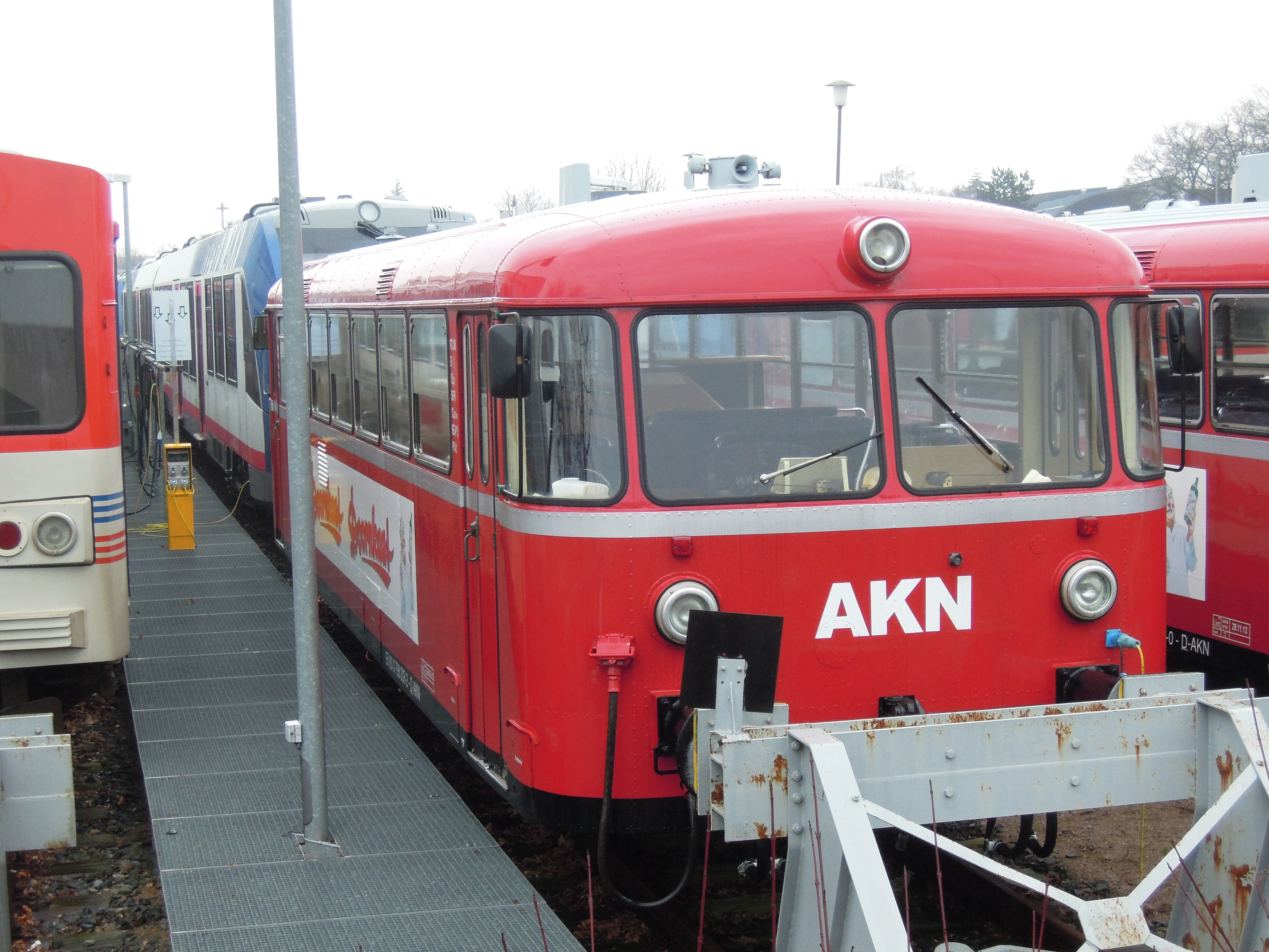 Der Triebwagen VT 3.08 wartet am 6. Januar 2016 auf einem Abstellgleis im Bw Kaltenkirchen auf seine nächste Sonderfahrt. Im Hintergrund ein moderner LINT Triebwagen. Link angeschitten ein VTA.
