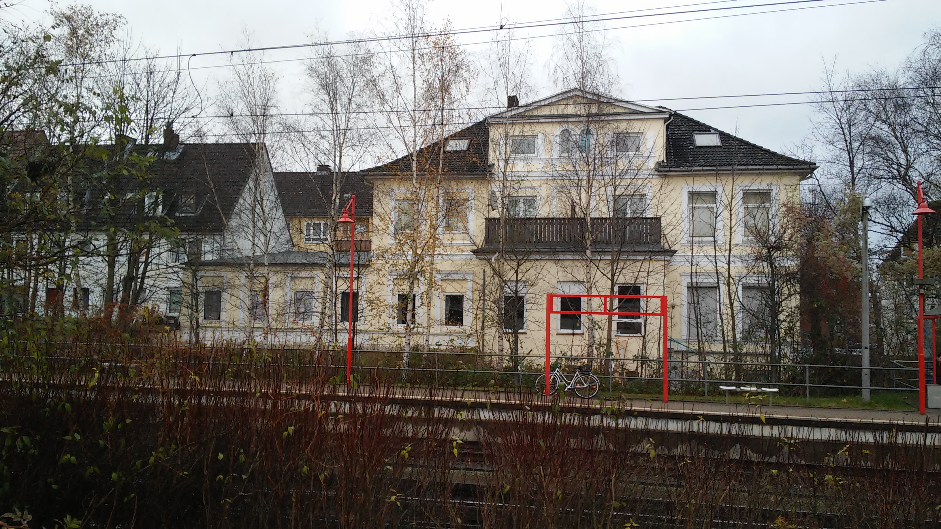 Blick von Gleis 3 des Bf Elmshorn auf das ehemalige Direktionsgebäude der EBOE hinter Gleis 1a. Das Stationsschild "Elmshorn" der AKN Linie A3 fehlt zum Zeitpunkt der Aufnahme am 21. November 2015.