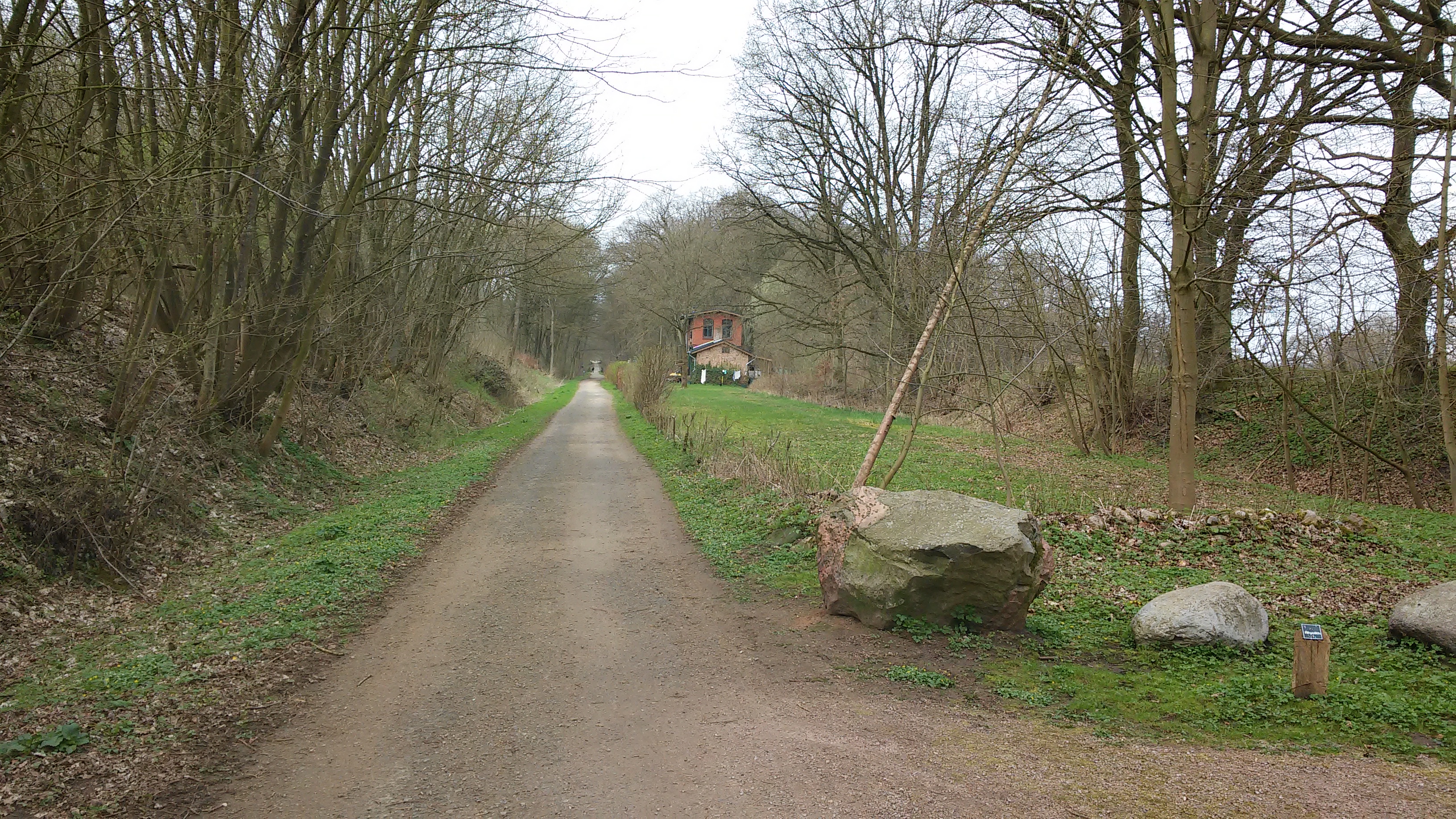 Blick vom Ende des ehemaligen Bf Grabau auf das ehemalige Empfangsgebäude nach Westen. Aufnahme vom 10. April 2016.