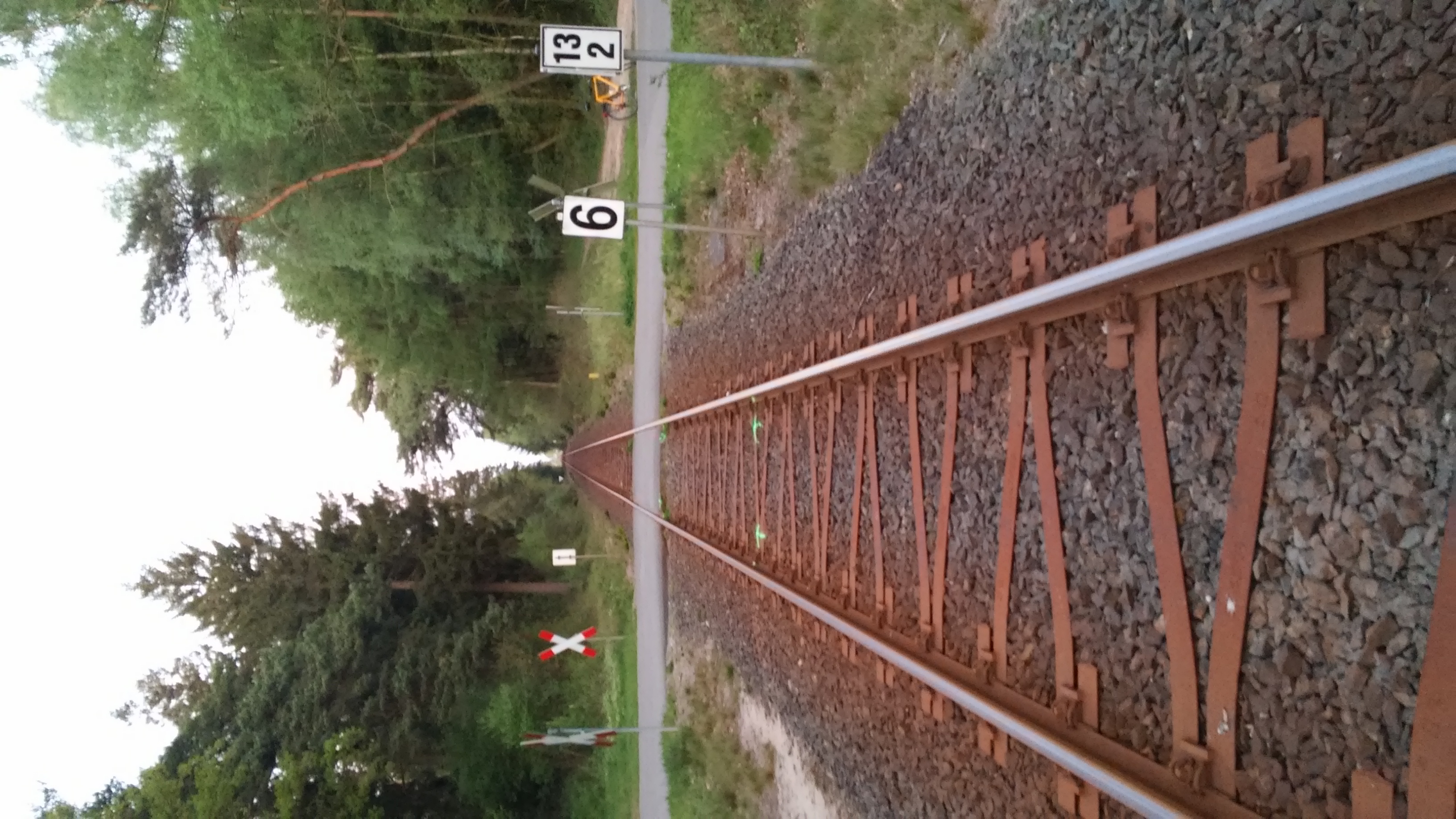 Blick auf den Bü Heeder Tannen in Richtung Osten am 9. Mai 2016. Typisch für diesen Teil der Strecke sind die sog. Y-Schwellen aus Stahl.