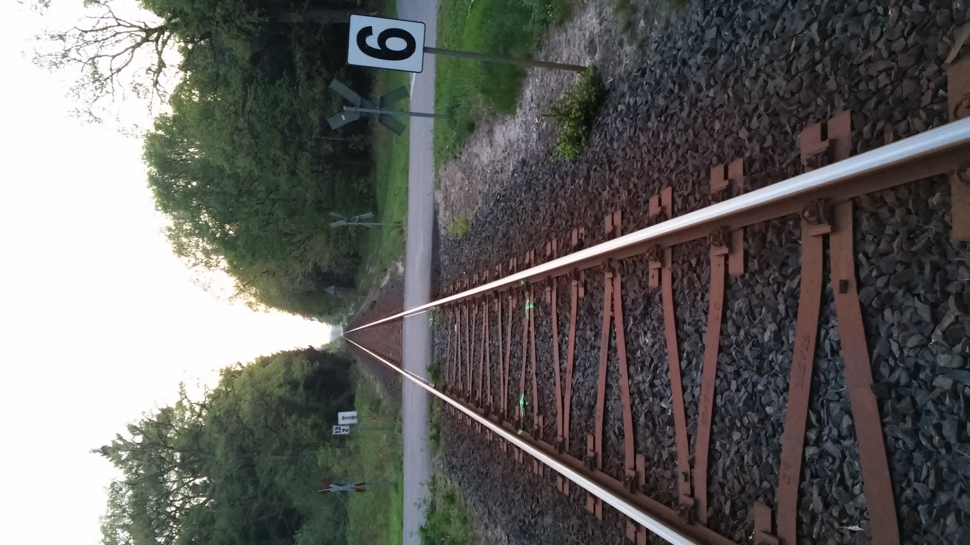 Blick auf den Bü Heeder Tannen in Richtung Westen am 9. Mai 2016. Typisch für diesen Teil der Strecke sind die sog. Y-Schwellen aus Stahl.