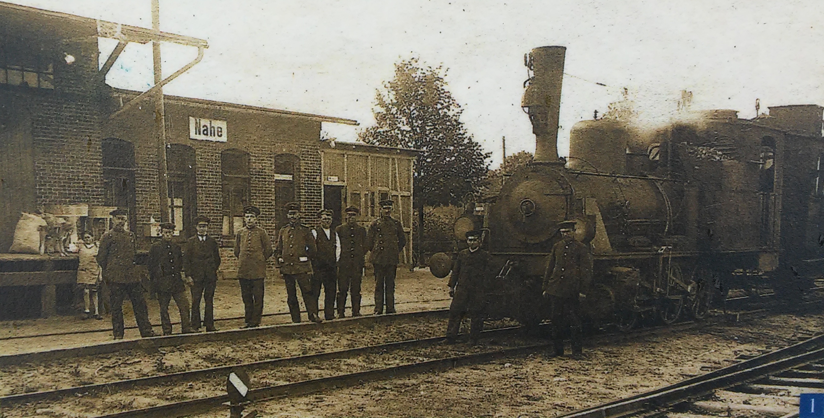 Empfangsgebäude des Bf Nahe im Jahr 1920 mit Lok 2 und vielen Personen, abfotografiert von der Infotafel am ehemaligen Standort des bereits abgerissenen Gebäudes vom 12. Juni 2016.