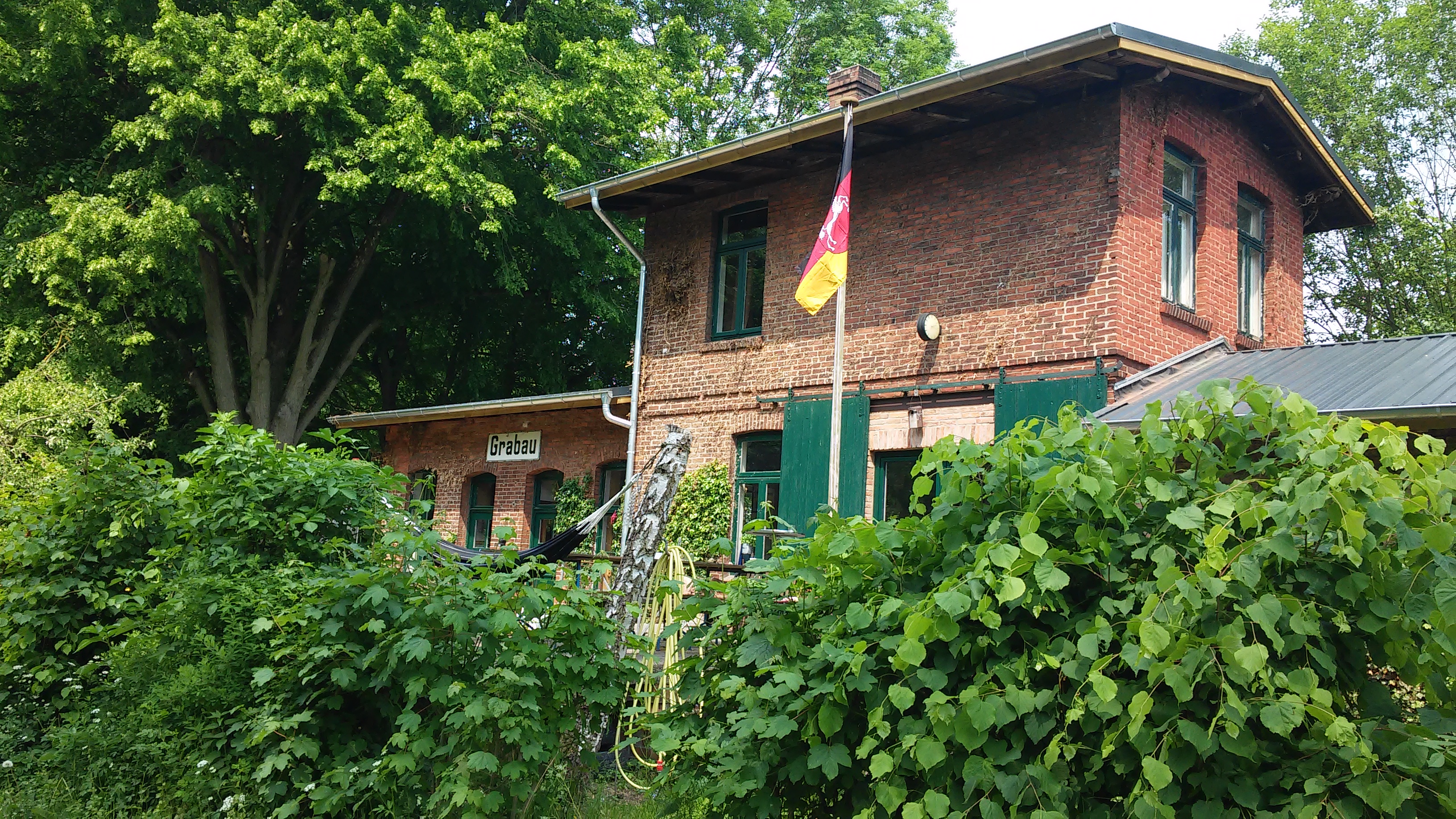 Blick vom Radweg auf der ehemaligen EBOE Trasse auf das privat genutzte Empfangsgebäude des Bf Grabau am 6. Juni 2015.