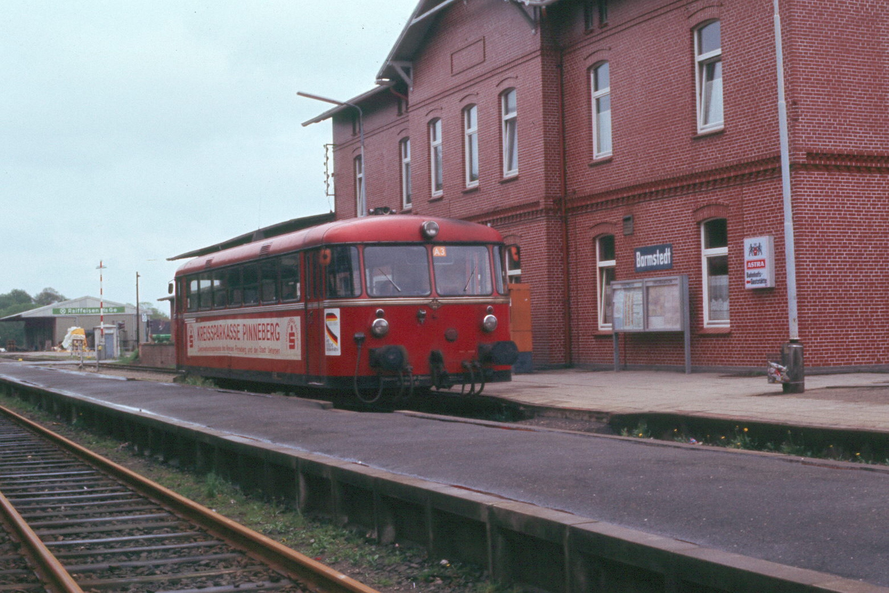 Am 11. Mai 1986 steht der Triebwagen VT 3.08 an Gleis 1 im Bf Barmstedt. Gut zu sehen ist hier die "schiefe" Werbung für Kreissparkasse Pinneberg auf der Nordseite. Die Aufnahme stammt aus der Sammlung von Thomas Beller.