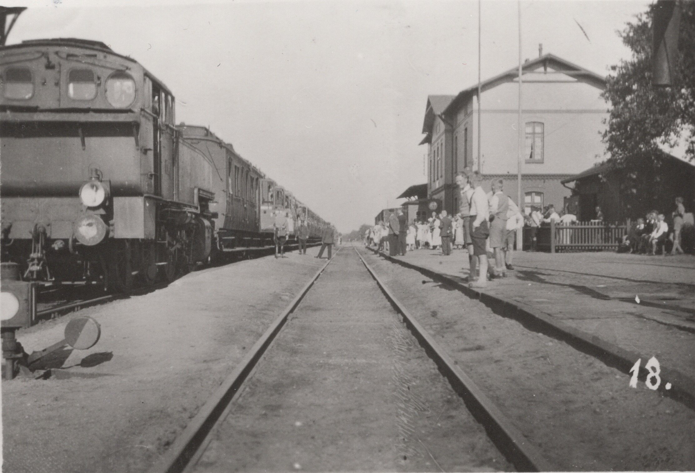 Dampflok der EBOE mit langem Personenzug im Jahre 1941 auf Gleis 2 des Bf Barmstedt. Der Bahnhof ist zum Zeitpunkt der Aufnahme voller Leute. Der Author der Aufnahme ist unbekannt.