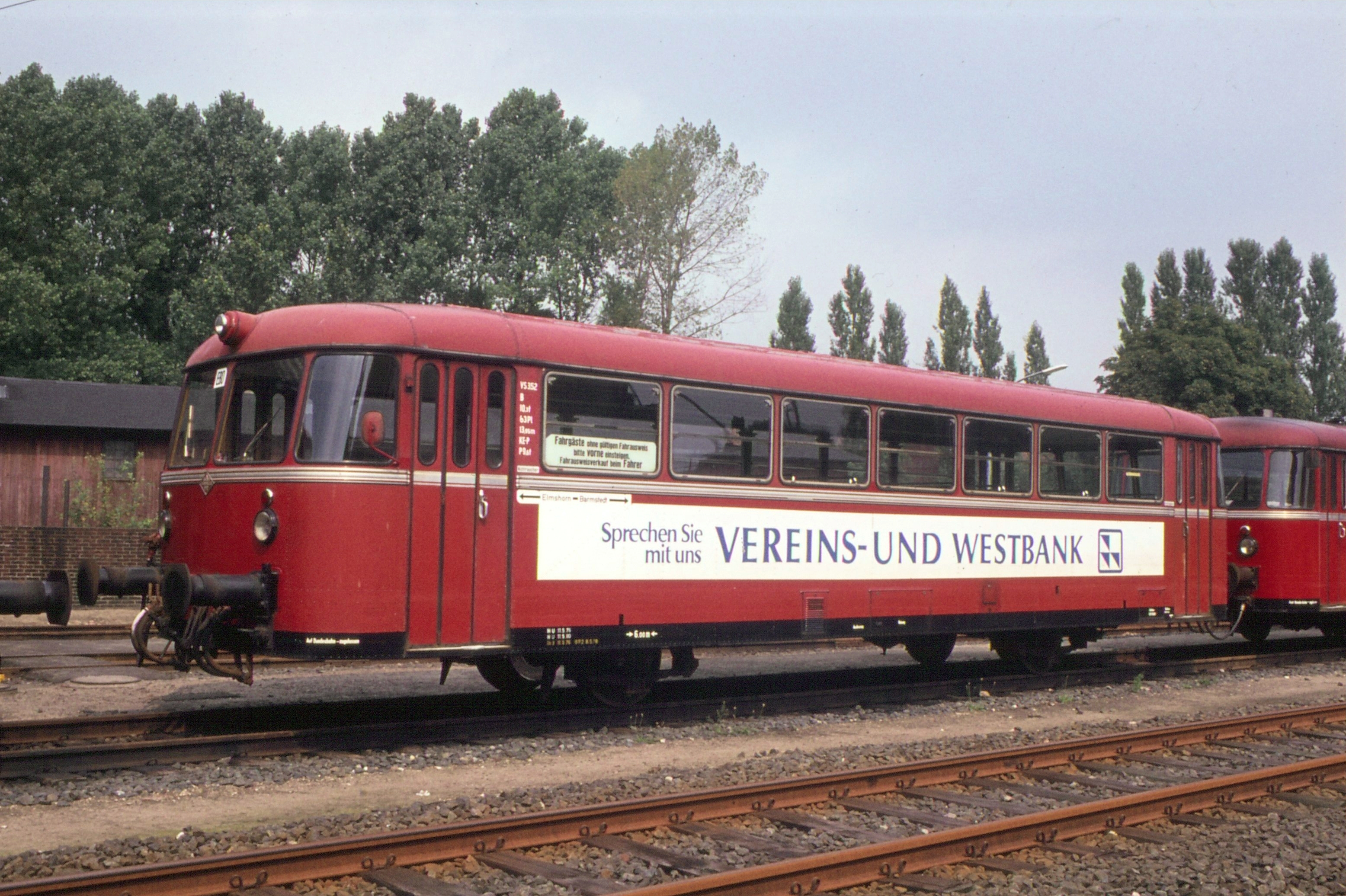 Diese Aufnahme zeigt den Steuerwagen VS 3.52 in Barmstedt vor dem Lokschuppen. Dahinter ein unbekannter Motorwagen. Die Aufnahme stammt aus dem August 1978.