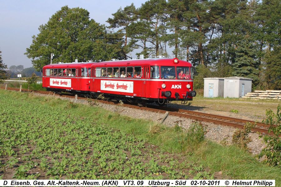 Recht aktuell und deutlich außerhalb der HiFo-Zeitschiene ist die nun folgende Aufnahme. Als „Kuddel Barmstedt“ haben nämlich die VT3. 08 und VT3. 09 überlebt und werden nach wie vor von der AKN unter ihren alten Betriebsnummern als Gesellschaftstriebwagen eingesetzt – und „Doornkaat“ ist nach wie vor dabei. Das Foto zeigt den VT3. 09 in der Verbindungskurve von der AKN-Strecke von Eidelstedt zur Strecke nach Norderstedt-Mitte