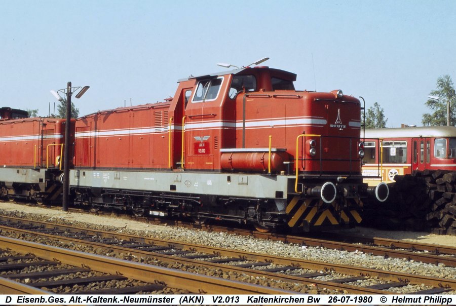 Nach der Stilllegung des EBOE-Streckenabschnittes von Henstedt-Ulzburg nach Oldesloe hatte die Bahn für ihre Großdiesellok V3. 023 keine Verwendung mehr und übergab diese Lok daher der AKN. Dort erhielt die von Deutz 1968 (Nr.58233) gebaute Lok die Bezeichnung V2. 013. Am 26. Juli 1980 fotografierte ich die ehemalige EBOE-Lok auf dem Bw-Gelände der AKN in Kaltenkirchen: