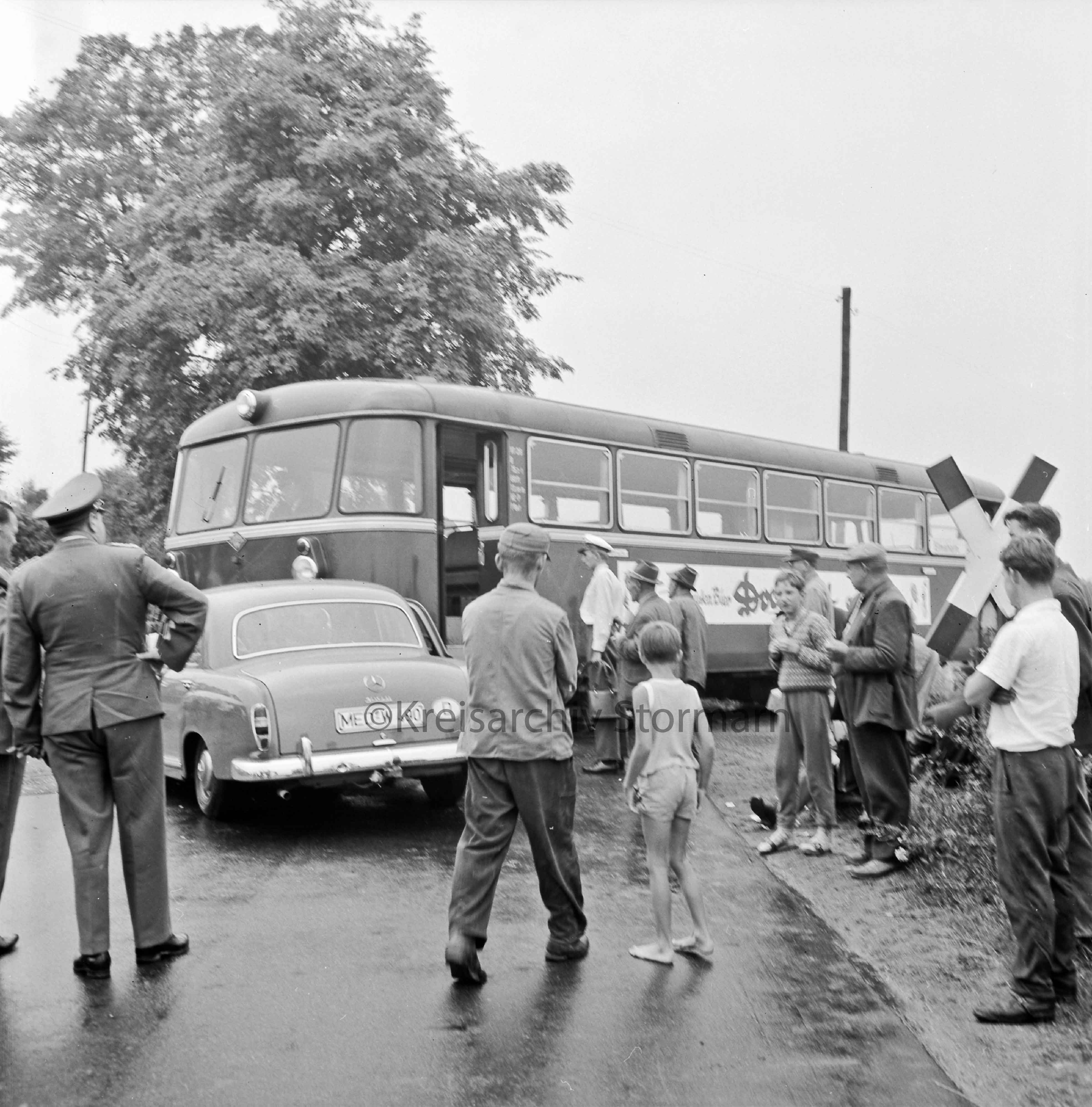 Dieses Bild zeigt einen Unfall am Bahnübergang Rümpeler Weg aus dem Jahre 1963. Beteiligt waren ein Uerdinger Schienenbus der EBOE und ein PKW der Marke Mercedes Benz. Der PKW hat nach dem Unfall nur noch Schrottwert während der Triebwagen nur wenig Schaden genommen hat.