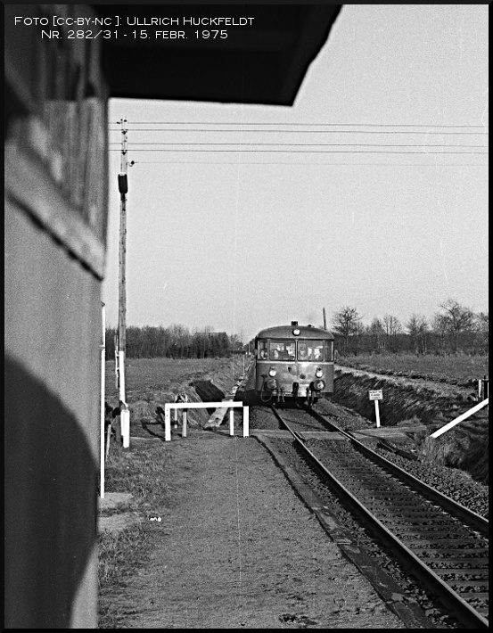 Der Triebwagen VT 3.10 beim Erreichen des Hp Bokholt. Das Bild wurde am 15. Februar 1975 von Ulrich Huckfeldt aufgenommen.